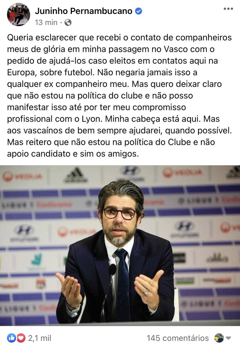 Por meio de sua página oficial no Facebook, @Juninhope08 deixou claro que não tem ligação com a política do Vasco e não está apoiando candidato algum. Ontem, durante a Live de apresentação da @semprevascoofic , o grupo declarou que o ídolo do Vasco da Gama apoiaria a chapa. Veja: