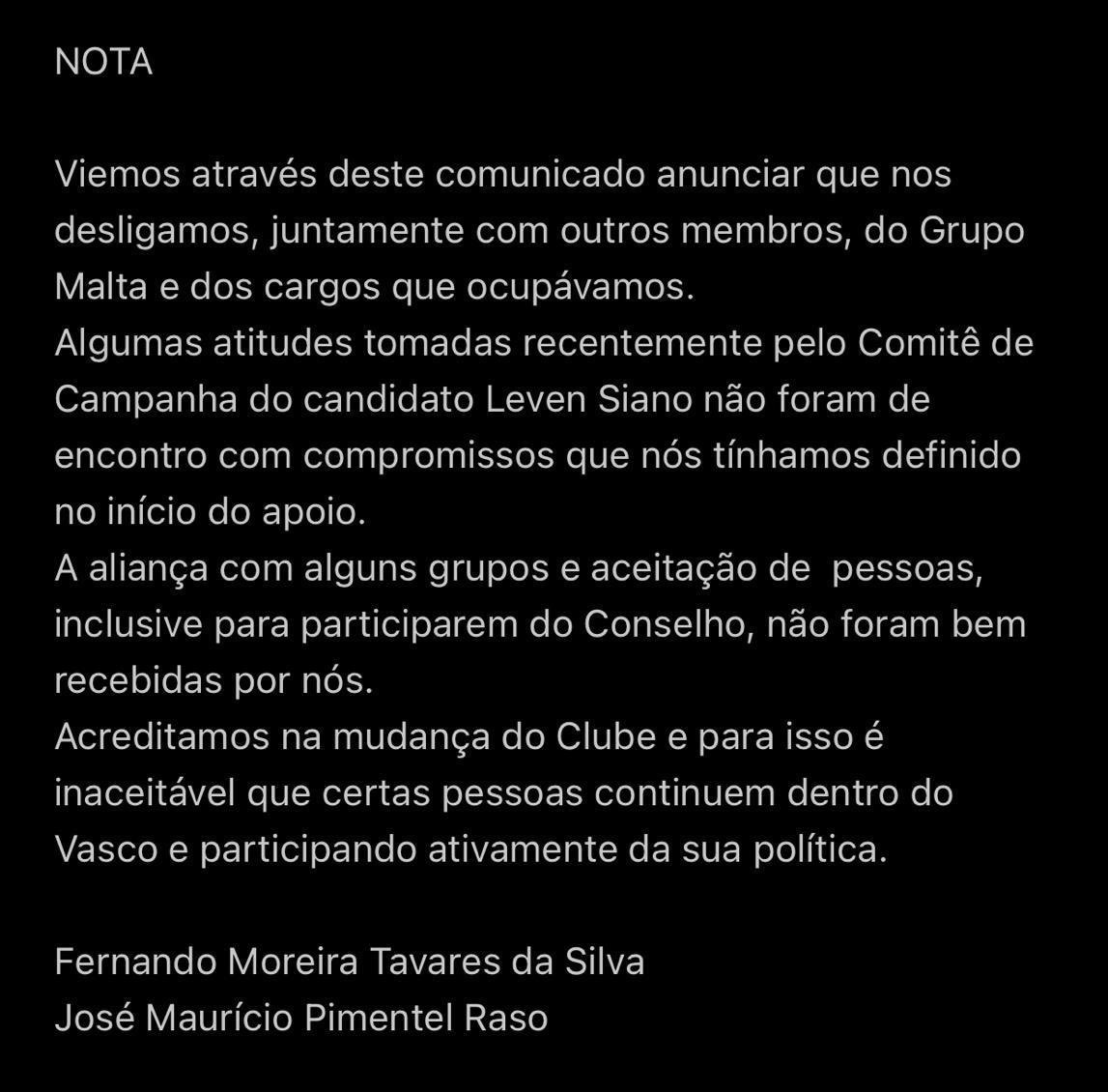 Fernando Tavares e José Maurício anunciaram em nota o desligamento do grupo Malta do Vasco, que apoia Leven Siano.