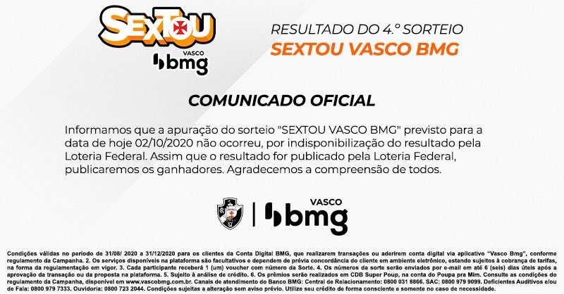 BMG informa que não apurou o resultado do sorteio 'Sextou Vasco BMG' desta semana