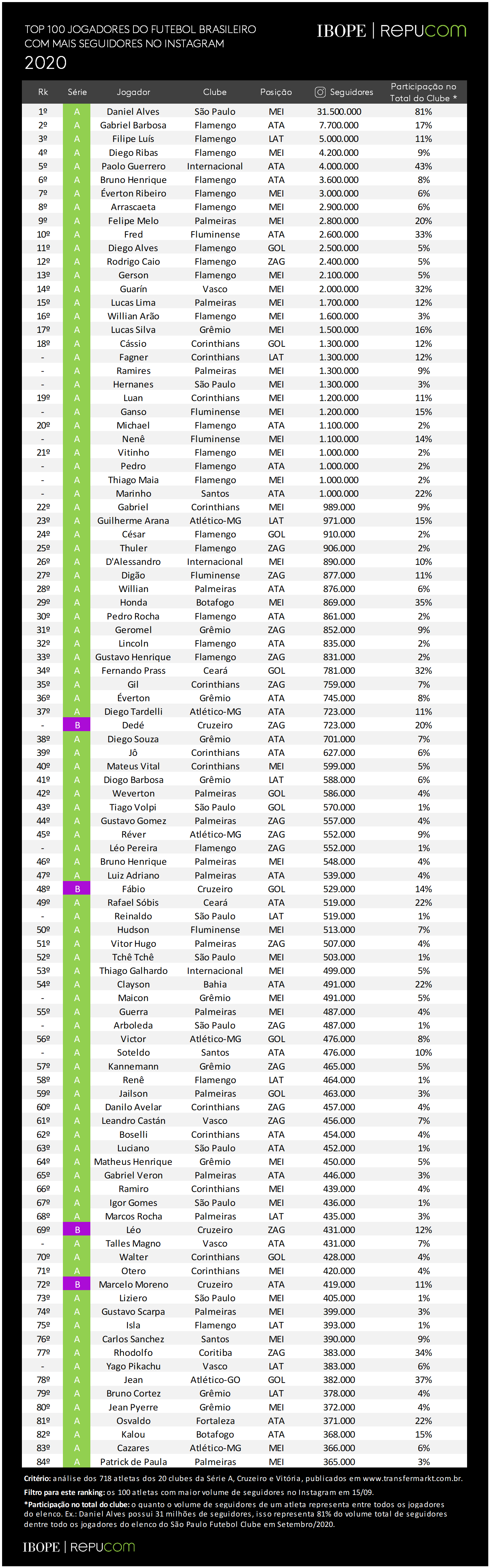 O IBOPE Repucom avaliou a popularidade dos atletas no Instagram, considerada a rede social com maior incidência de atletas que atuam no futebol brasileiro, e o camisa 10 do São Paulo Futebol Clube, Daniel Alves, lidera o ranking com mais de 31 milhões de seguidores na rede. No top 5 do ranking, a estrela do SPFC é seguida por três jogadores do Flamengo – Gabigol com 7,7 milhões seguidores, Filipe Luís com 5 milhões e Diego Ribas com 4,2 milhões – e um do Internacional, o peruano Paolo Guerrero com 4 milhões de fãs na rede. A análise considerou os 20 clubes da Série A, além do Cruzeiro e Vitória.