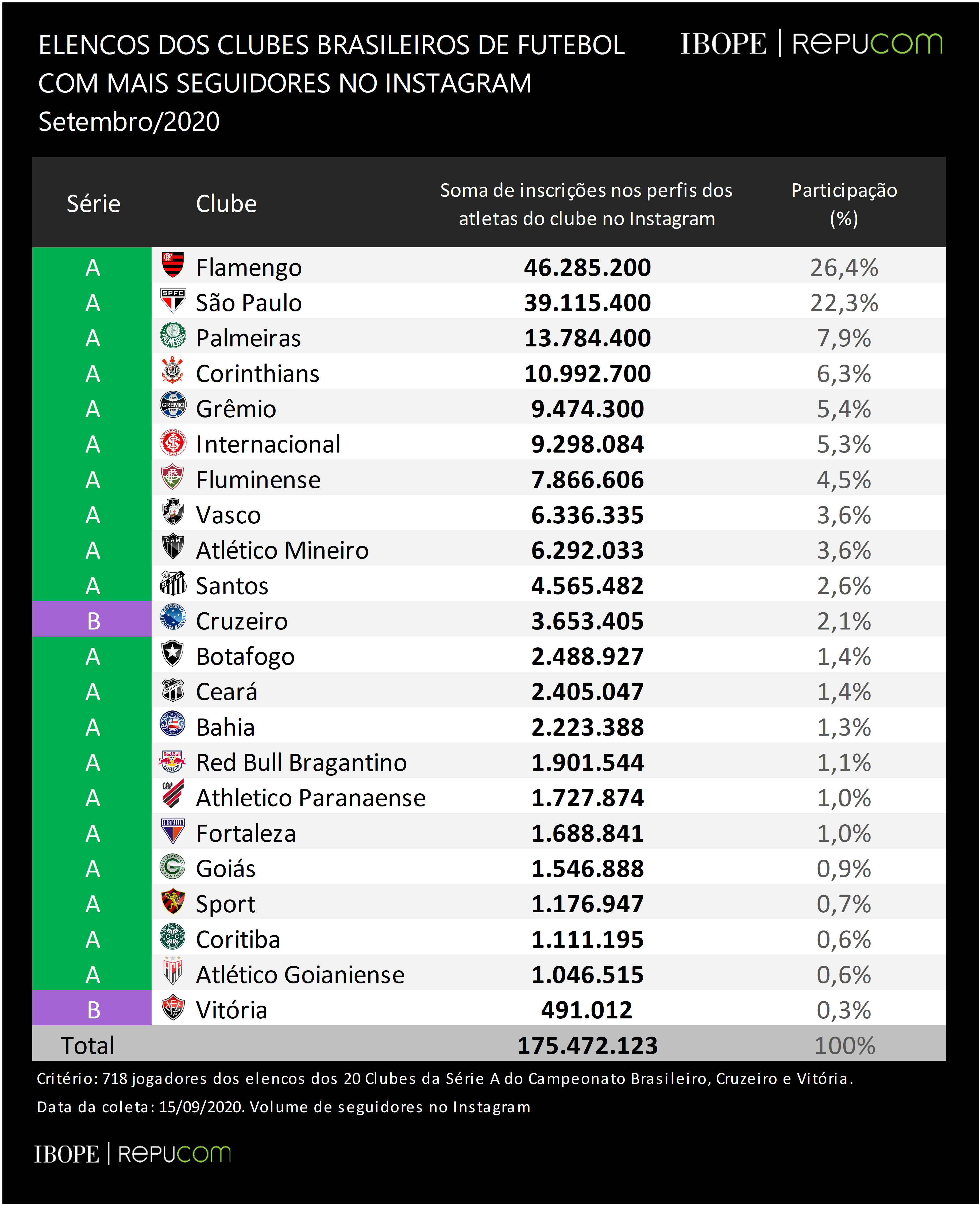 Os três clubes com maior volume de seguidores entre seus atletas são respectivamente: Flamengo, São Paulo e Palmeiras. Os três clubes representam 57% do valor acumulado de inscrições entre os mais de 700 jogadores das 22 equipes mapeadas. O Flamengo, líder no acumulado, possui 46,2 milhões de seguidores entre todos seus atletas, o que corresponde a 26% do valor total entre todos os clubes. Ou seja, 1 a cada 4 seguidores de atletas de futebol dos clubes mapeados segue um atleta do Flamengo.