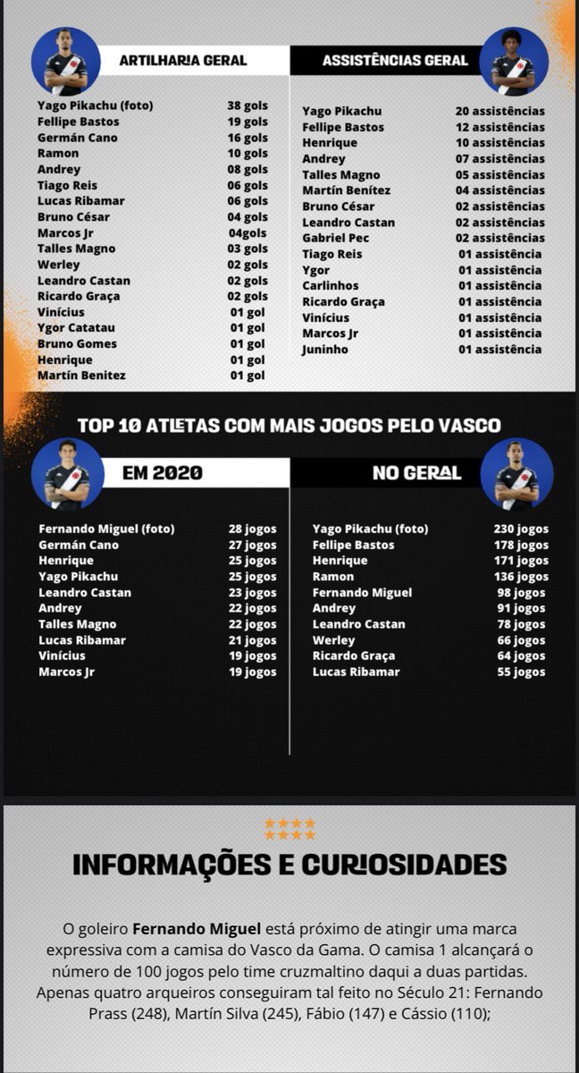 Agora uma série de boas informações e curiosidades sobre a temporada e também a partida deste domingo, às 20h30, contra o Atlético-MG. O material foi disponibilizado pela assessoria do Vasco: