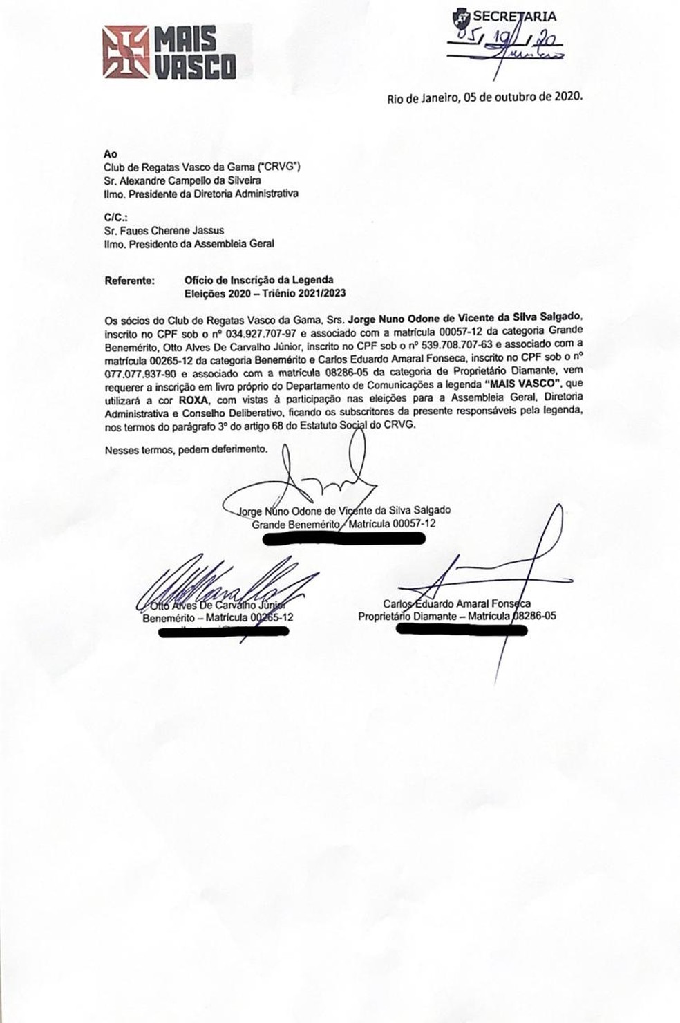 Conforme o Estatuto do Vasco, três sócios votantes devem endereçar um ofício com a candidatura ao presidente da Diretoria Administrativa, no caso Alexandre Campello. Em nome de Salgado, Jorge Nuno Odone de Vicente da Silva Salgado, Otto Alves de Carvalho Junior e Carlos Eduardo Amaral da Fonseca o fizeram.