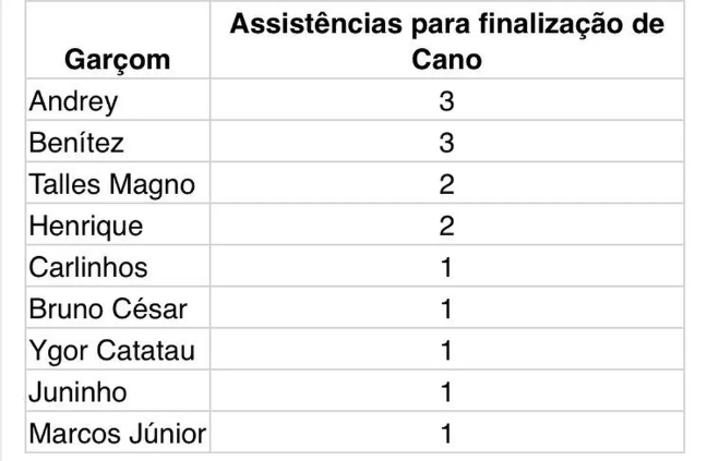Andrey e Benítez são os caras que mais deram passes para finalizações de Cano no Brasileiro. Nesse período de seca, a dupla foi desfalque em alguns jogos. O argentino foi ausência contra Coritiba e Bragantino, enquanto o volante ficou fora no jogo de ida contra o Botafogo e também nos jogos no Couto Pereira . Os dois, porém, estiveram em campo contra o Atlético-MG, e Cano pouco apareceu na partida.