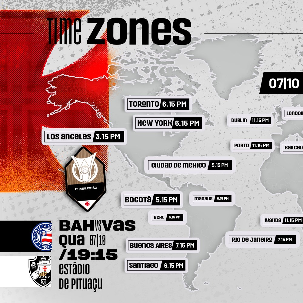 Vasco divulga horário do jogo desta 4ª-feira contra o Bahia para os torcedores espalhados pelo mundo