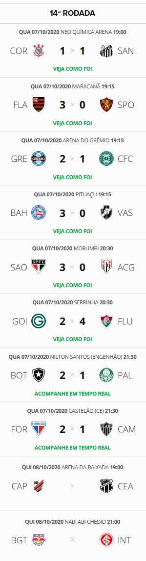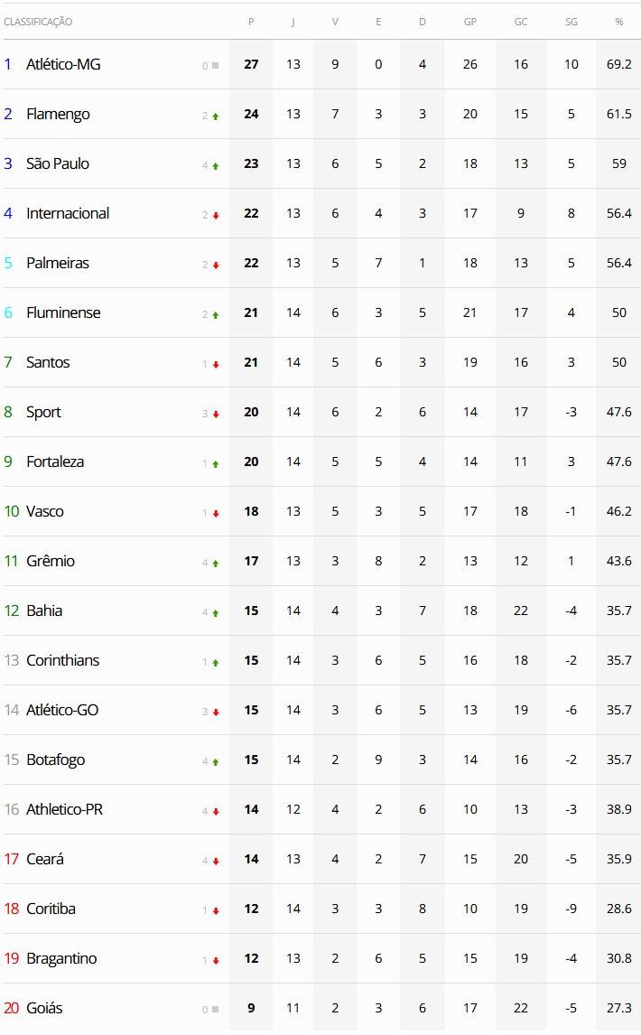 Terminados os jogos de quarta-feira da 14ª rodada do Campeonato Brasileiro, o Vasco, que foi derrotado pelo Bahia por 3 a 0, caiu da 9ª para a 10ª colocação. Os resultados dos jogos de quinta-feira, que fecham a rodada, não influirão na colocação do Gigante da Colina.