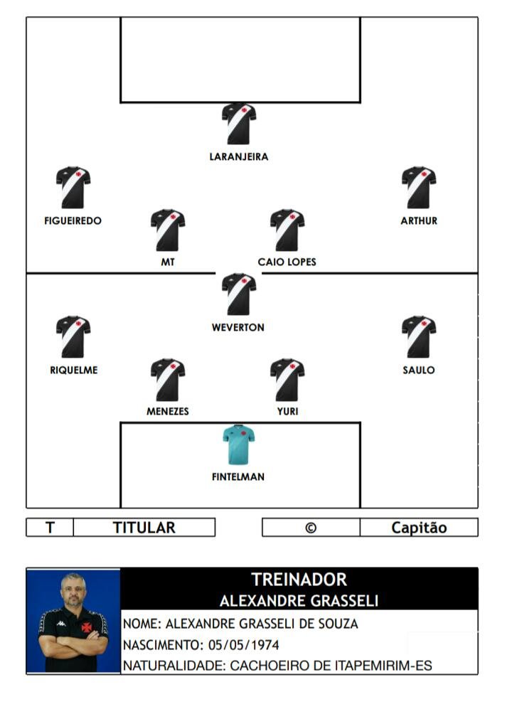 Vasco escalado para enfrentar o Bangu pela semifinal da Taça Guanabara Sub-20: Fintelman; Saulo, Yuri, Menezes e Riquelme; Weverton, Caio Lopes e MT; Arthur, Figueiredo e Laranjeira. Técnico: Alexandre Grasseli.