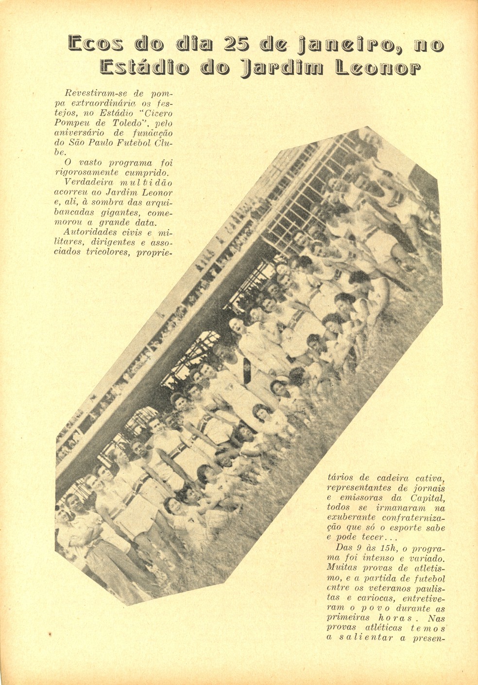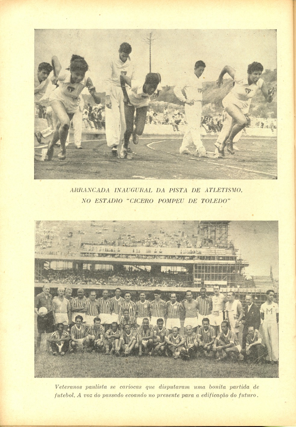 Em 25 de janeiro de 1957, em comemoração ao aniversário da cidade e do clube, o São Paulo inaugurou a pista de atletismo do Morumbi, antes mesmo do estádio. Foram as primeiras atividades esportivas oficiais da casa tricolor. A festa do atletismo ocorreu das 9h às 15h, com inúmeras provas na pista que também não estava finalizada. As festividades serviam para angariar dinheiro para as obras. Houve uma partida amistosa entre jogadores veteranos de São Paulo e do Rio de Janeiro. Mas o grande astro do dia foi o bicampeão olímpico Adhemar Ferreira da Silva.