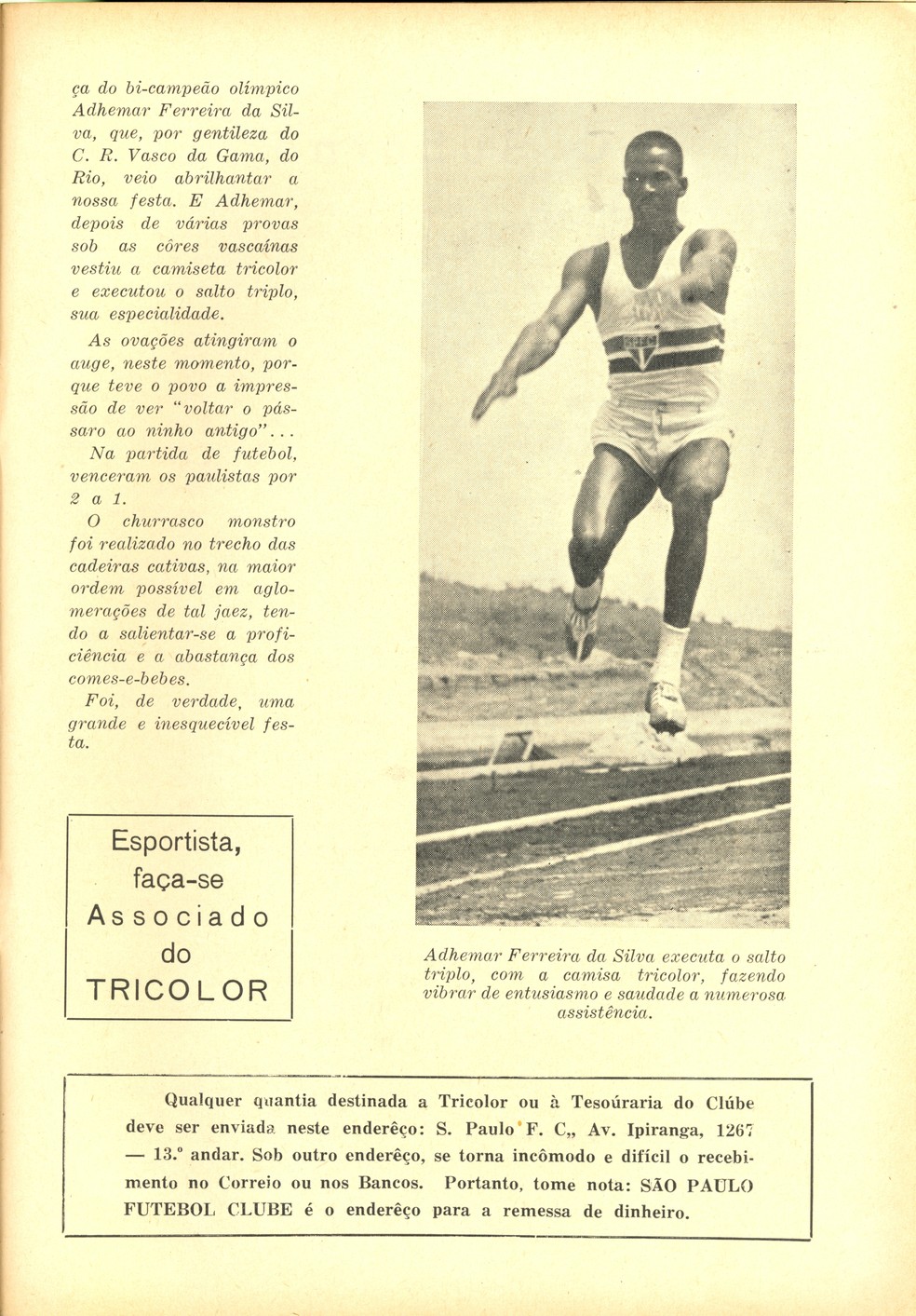 O curioso é que, em 1957, Adhemar já era atleta do Vasco da Gama. Mas o clube carioca o cedeu para aquela festa de arrecadação e inauguração da pista de atletismo do Morumbi. E com a camisa são-paulina o recordista mundial do salto triplo venceu com a marca de 15m20.