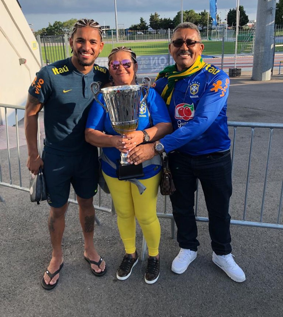 Douglas com o troféu em Toulon: melhor jogador da competição e o abraço carinhoso da mãe Leda e do pai, o seu Bigode |