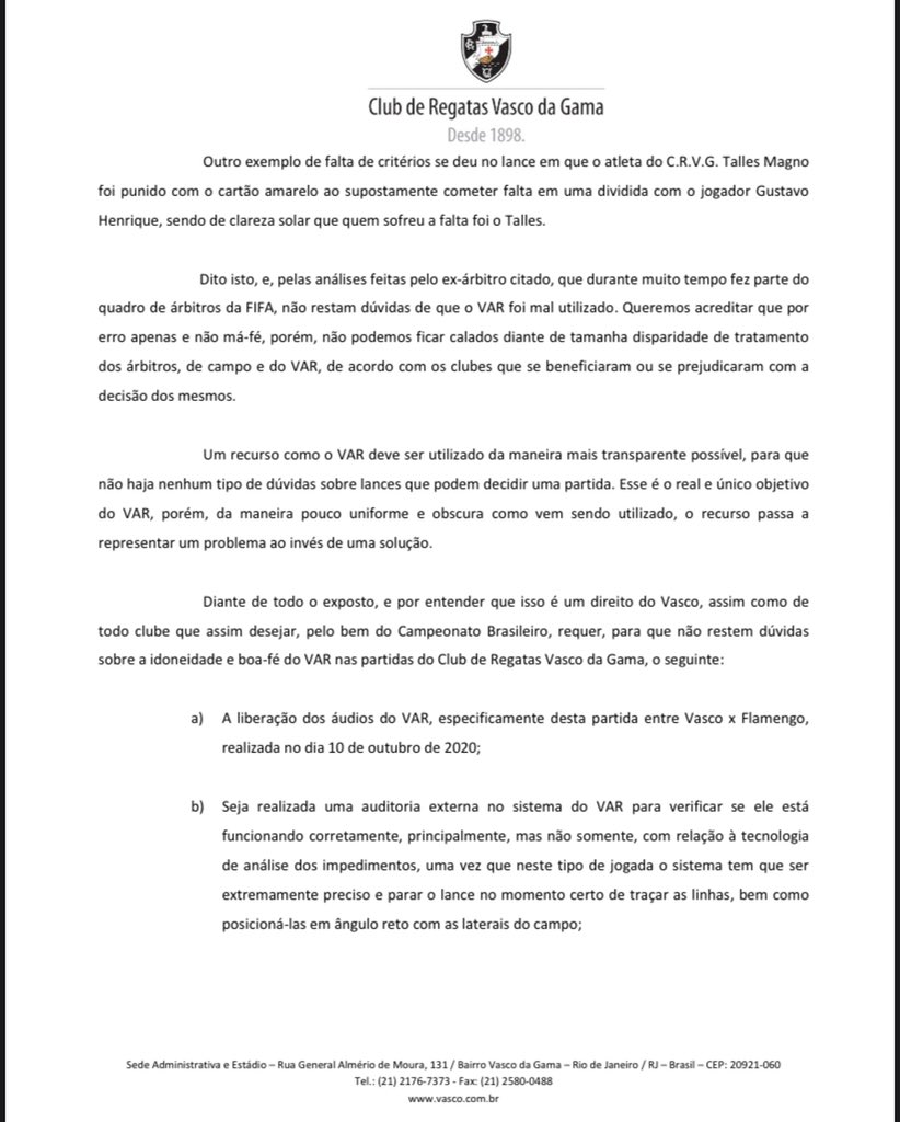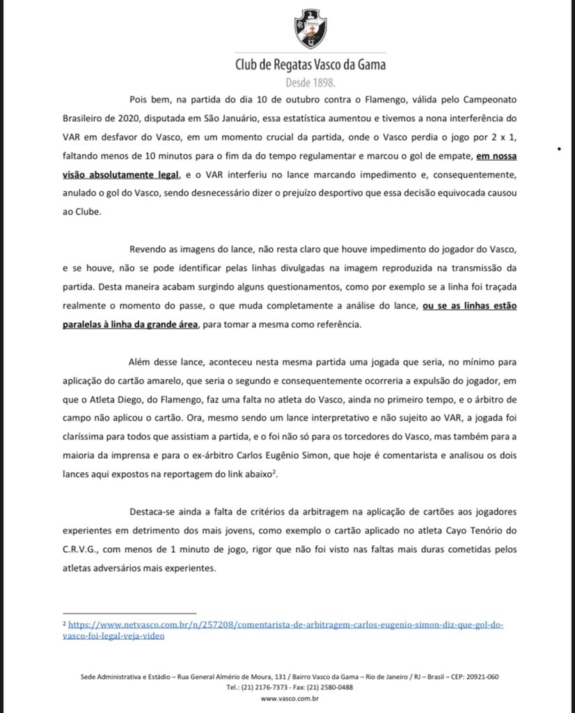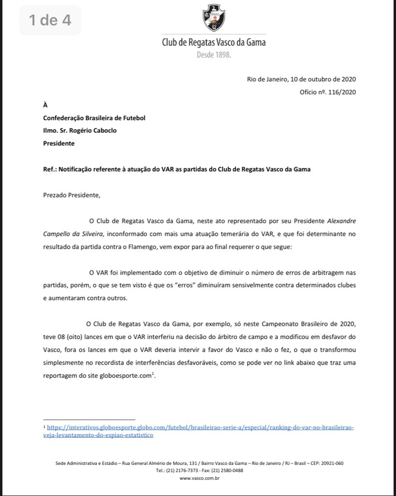 O Vasco notificou a CBF por conta da atuação do VAR em relação aos jogos do Cruz-Maltino no Campeonato Brasileiro. Das 14 decisões do VAR em relação ao clube, 9 foram contra e 4 a favor. Veja o ofício, que já foi protocolado na CBF, na íntegra. ?? #CanaldoPedrosa