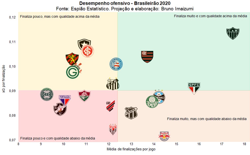 Na tabela de classificação, o Atlético-MG tem apenas dois pontos de vantagem em relação ao vice-líder Internacional, que já disputou um jogo a mais, mas nas estatísticas de qualidade, o time mineiro sobra muito mais. Em parceria com o economista Bruno Imaizumi, analisamos as finalizações das equipes considerando a frequência com que concluem em gol e a qualidade de cada, quanto risco ela levam aos adversários.
