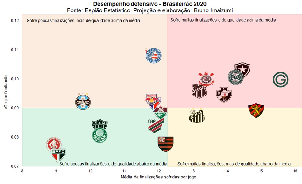No canto inferior à esquerda, aparecem Internacional e São Paulo, duas defesas que permitem menos finalizações aos adversários e também com baixa qualidade, o que torna muito difícil fazer um gol contra eles. O Internacional sofre em média 8,9 finalizações por jogo, e o São Paulo, 9,1.