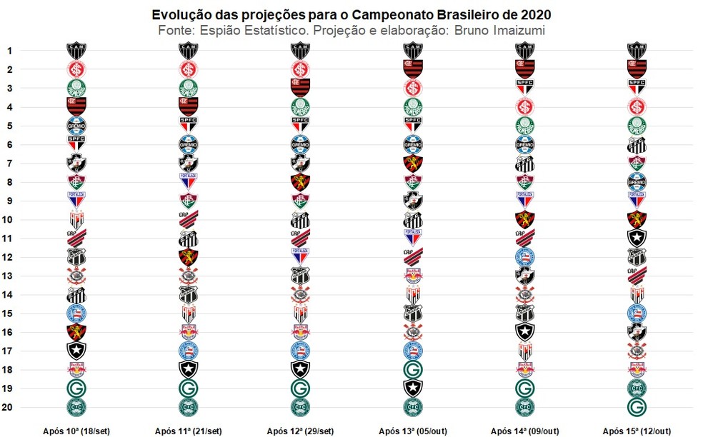Os dados de xG permitem fazer análises profundas. A arte abaixo foi feita a partir da simulação de 10 mil jogos para cada partida que está para ser realizada no Brasileirão e projeta o que deve ser o futuro das equipes na competição se as características que elas apresentam forem mantidas até o final do campeonato. Percebe-se o São Paulo e o Santos subindo na classificação, o Grêmio despencando, assim como o Corinthians, que está na zona do rebaixamento. Ela mostra de outra forma aquelas projeções de chances de ser campeão e fugir do rebaixamento.