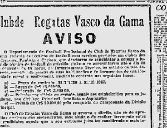 o ano de 1946, ainda na época do Expresso da Vitória, a diretoria buscava um substituto para o uruguaio Ondino Viera, um dos técnicos mais consagrados da história do futebol sul-americano, então decidiram colocar nos principais jornais em circulação no Rio de Janeiro, um anúncio de emprego para a vaga de treinador do Vasco.