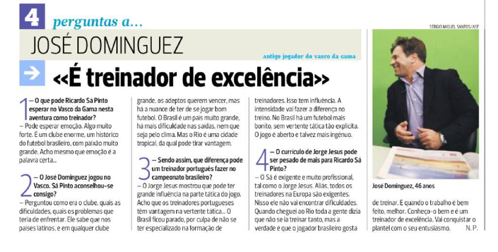 Jornal 'A Bola', de Portugal, entrevistou o português Dominguez, que jogou no Vasco, para comentar a ida de Sá Pinto para o time de São Januário. Vocês se lembram dele?