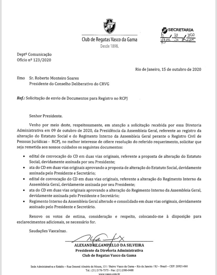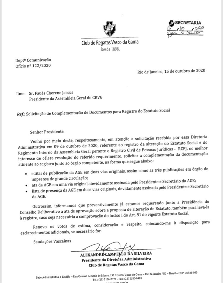 Procurando dar celeridade à alteração do Estatuto Social e do Regimento Interno da Assembleia Geral no que diz respeito às eleições diretas, o Clube solicitou ao Presidente da Assembleia Geral e ao Presidente do Conselho Deliberativo documentos que estão pendentes.