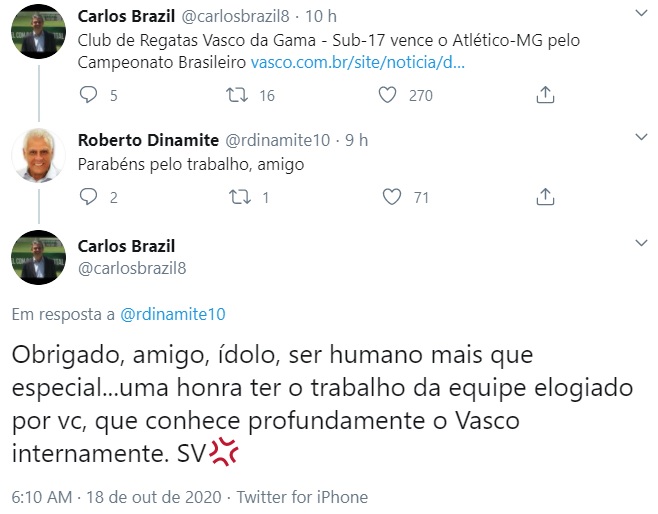 Fonte: Twitter do gerente da base Carlos Brazil, Twitter de Roberto Dinamite