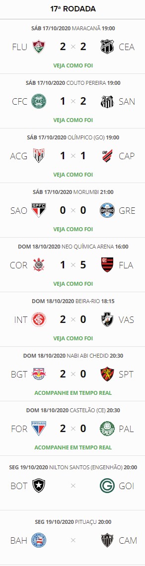 Terminados os jogos do fim de semana da 17ª rodada, Vasco cai para o 13º lugar do Brasileiro