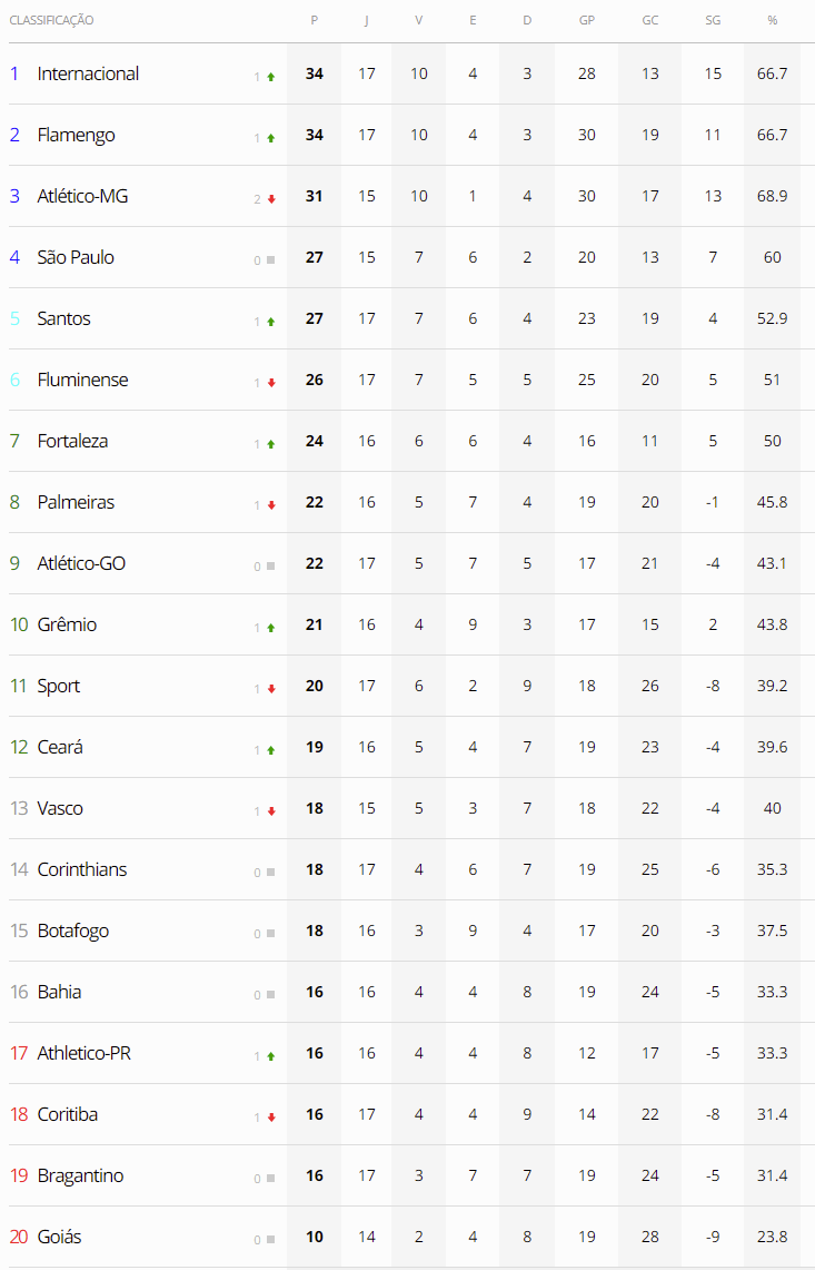 Terminados os jogos do fim de semana da 17ª rodada do Brasileiro, o Vasco, que foi derrotado pelo Internacional por 2 a 0, caiu da 12ª para a 13ª posição. Com 2 jogos a menos do que a maioria dos seus adversários, o Gigante da Colina está a 1 pontos da zona da Sul-Americana, a 9 pontos do G4 (zona da fase de grupos da Libertadores) a 7 pontos do G6 (zona da Pré-Libertadores) e a 2 pontos do Z4 (zona do rebaixamento).