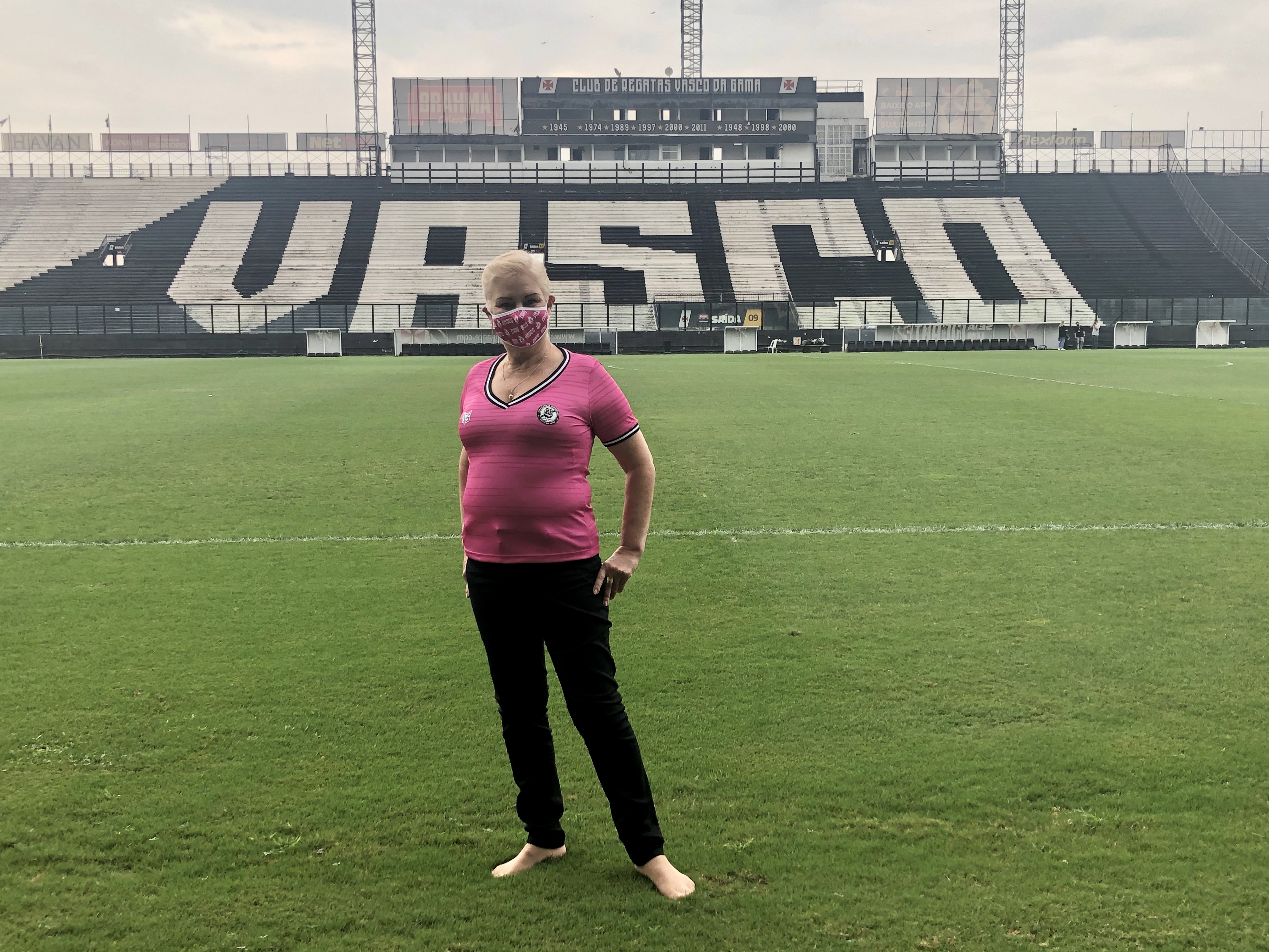 - A história é meio cômica, mas é legal. Foi na Arena Pernambuco. Eu tinha tido um acidente vascular cerebral (AVC). Se eu tivesse lá ou aqui poderia morrer do mesmo jeito, então eu quis ir atrás do Vasco no estádio. Nessa época eu ainda não falava muito sobre os meus problemas quando eu estava mal. O estádio não tinha elevador e para chegar lá eu precisei subir muitas escadas. Quando cheguei no topo eu não conseguia enxergar mais e fui sentindo que eu ia descansar ali mesmo. Falei com o meu marido que eu precisava voltar. Só que lá teve um problema sério. A polícia disse que quem subia não podia descer. Meu marido explicou que eu era cardíaca e precisava voltar, mas a polícia continuou negando ajuda. Fomos descendo contra as recomendações e o André foi algemado, porém foi me socorrer. Eu realmente estava infartando. O meu marido não saiu do meu lado e ainda recebeu um processo porque não deixou o médico me socorrer sozinho. Eu tomo muitos remédios e tenho vários problemas de saúde. Só o André sabia o que eu tive, o que eu tomava e as contraindicações que eu tenho. Por isso, ele não quis autorizar o medicamento que tentaram me oferecer.