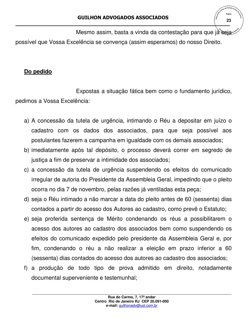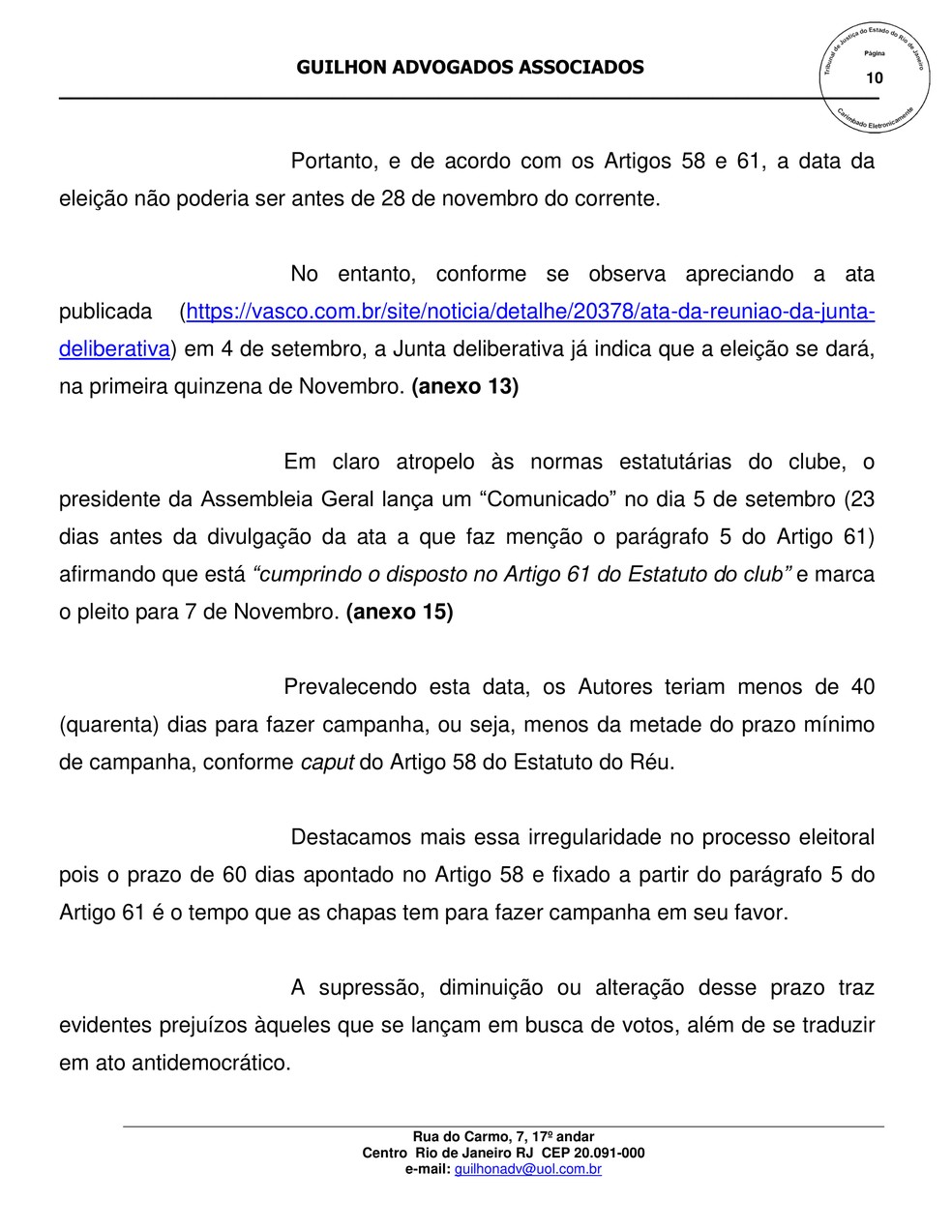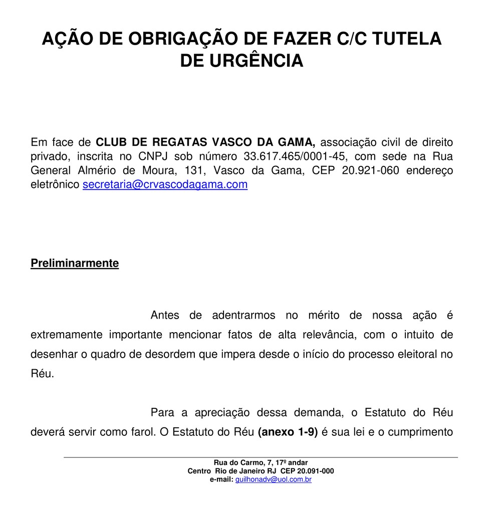 O pedido, dividido em nove tópicos, solicita a concessão de tutela de urgência para a suspensão de efeitos do comunicado feito por Faués Cherene Mussa, presidente da Assembleia Geral do Vasco, que, em 5 de setembro, convocou a Assembleia Geral Ordinária (eleições) para 7 de novembro.
