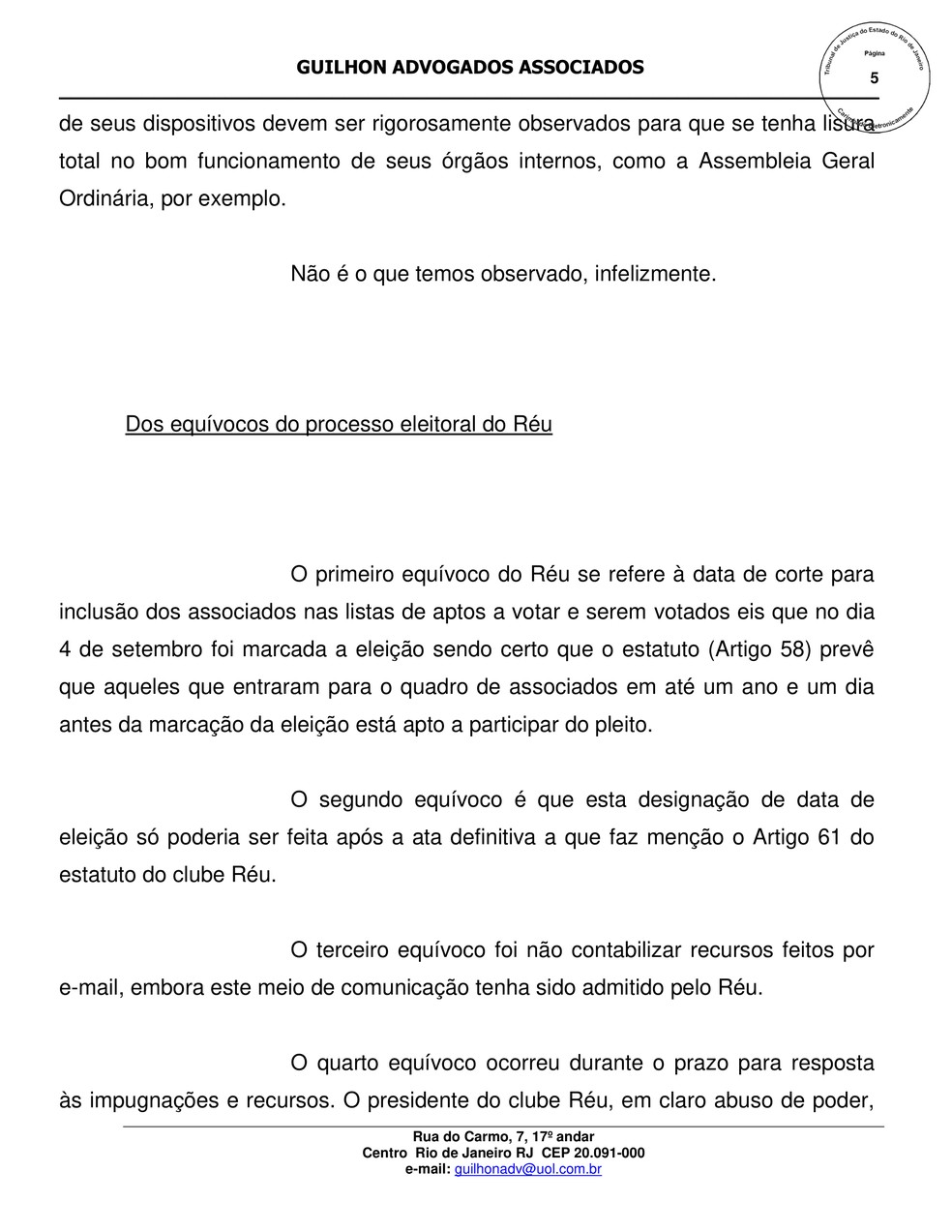 Entre a terceira e a quarta página do processo, a ação de Sérgio cita o que entende como erros referentes à data-limite para inclusão de sócios aptos a voto nas próximas eleições e críticas à condução feita pela Junta Deliberativa Eleitoral. (confira na imagem abaixo).