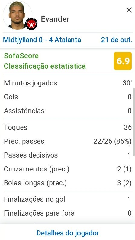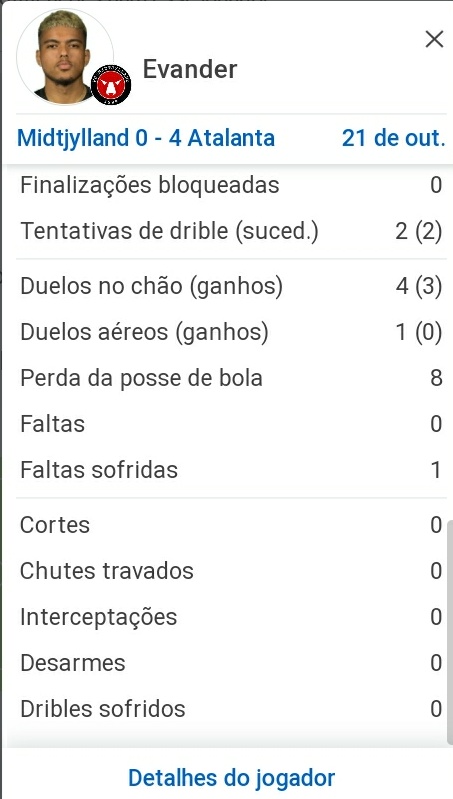 Evander, ex Vasco, teve sua estreia na UCL contra o Atalanta, seu time perdeu de 4x0 e essas são as informações do atleta na partida
