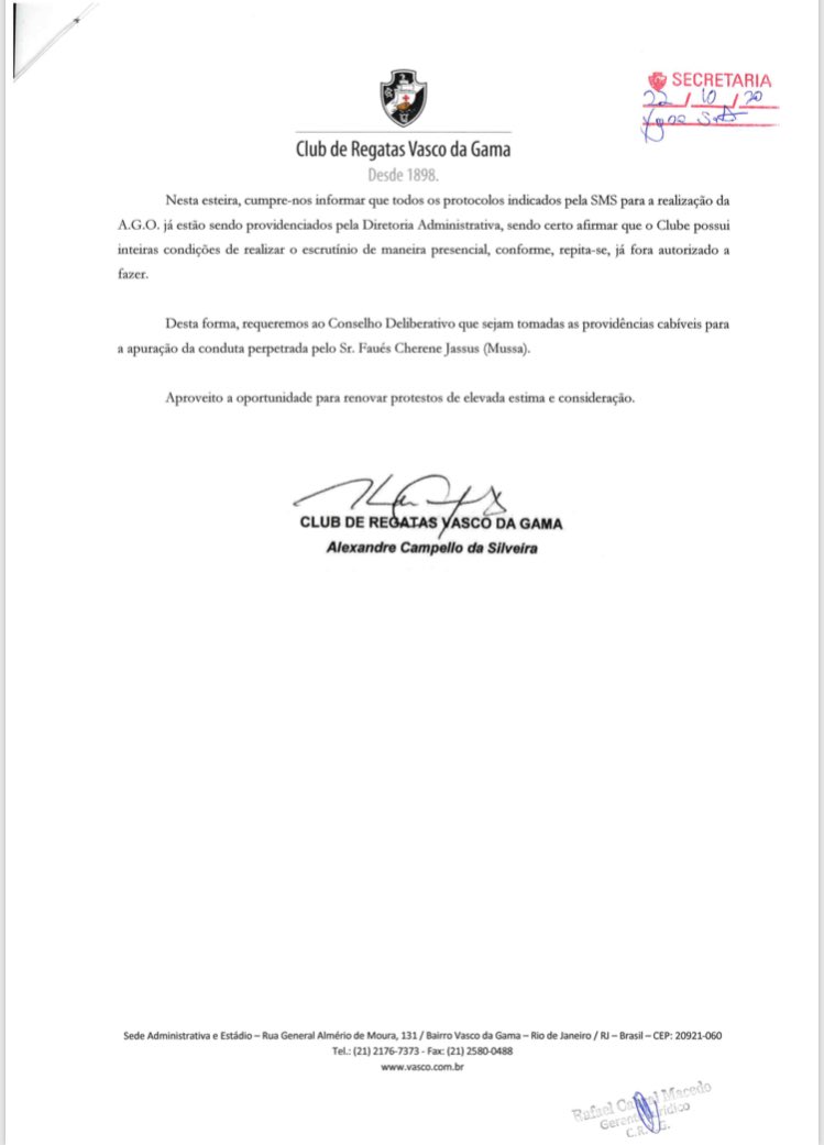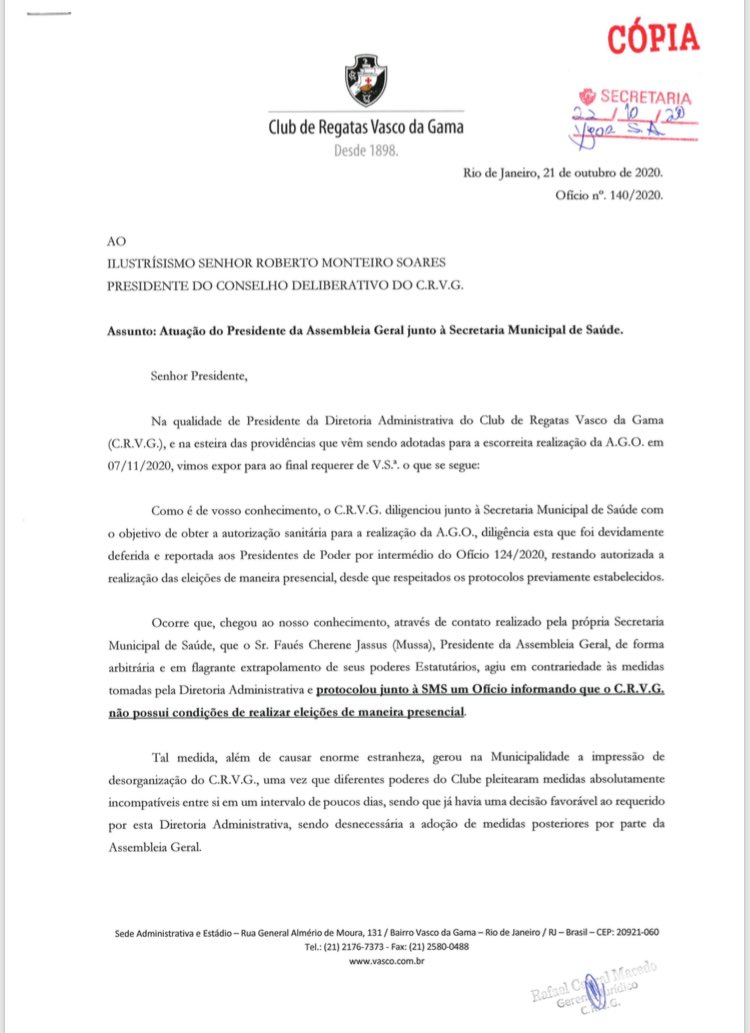 Presidente alega que o Clube conseguiu autorização da Secretaria de Saúde para realização de eleição presencial, mas que Mussa teria protocolado outro ofício informando que o Vasco não tem condições.