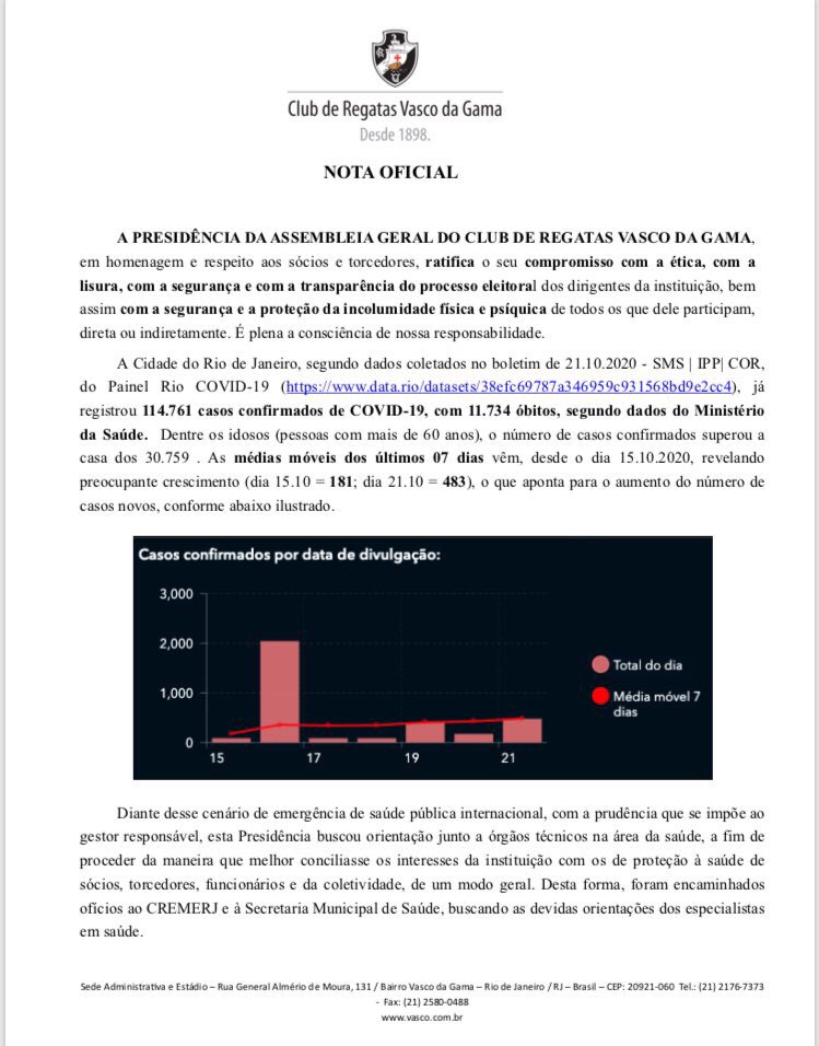 No texto, Mussa destaca ter 83 anos de idade e que 45% do quadro social do Vasco é composto por pessoas com mais de 60 anos. Estas integram o grupo de alto risco para a Covid-19.