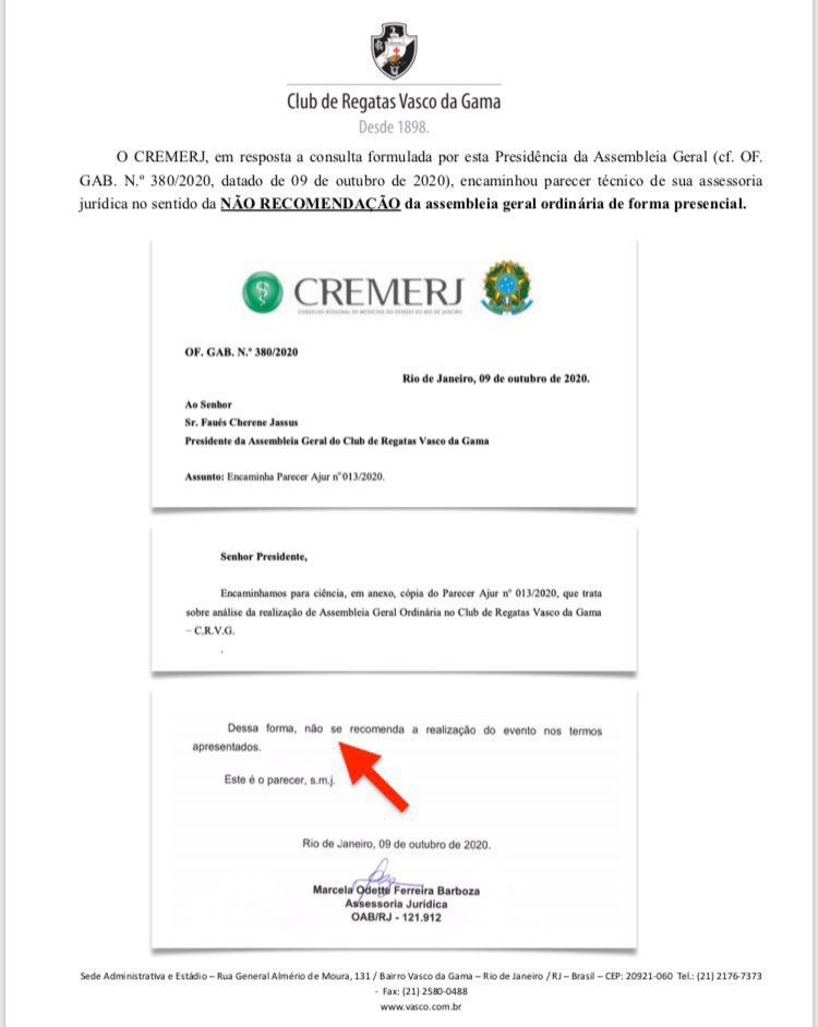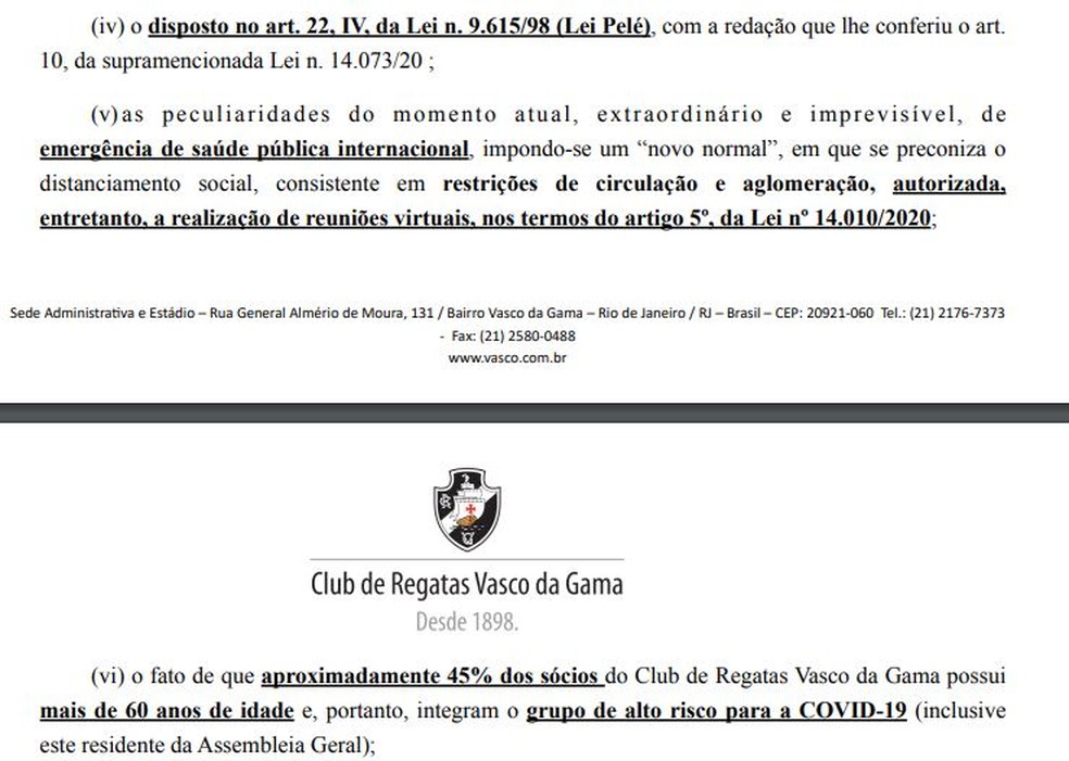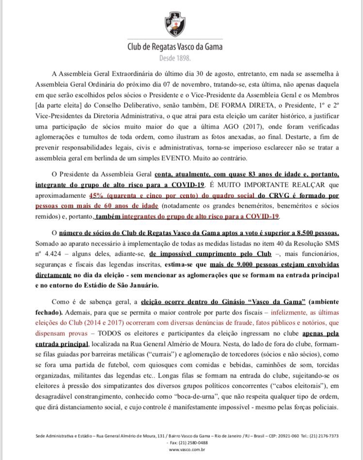 Ele relembra números da pandemia no Rio, destaca parecer do Conselho Regional de Medicina que não recomenda a AGO presencial e ressalta que 45% do quadro social é composto por pessoas de risco.