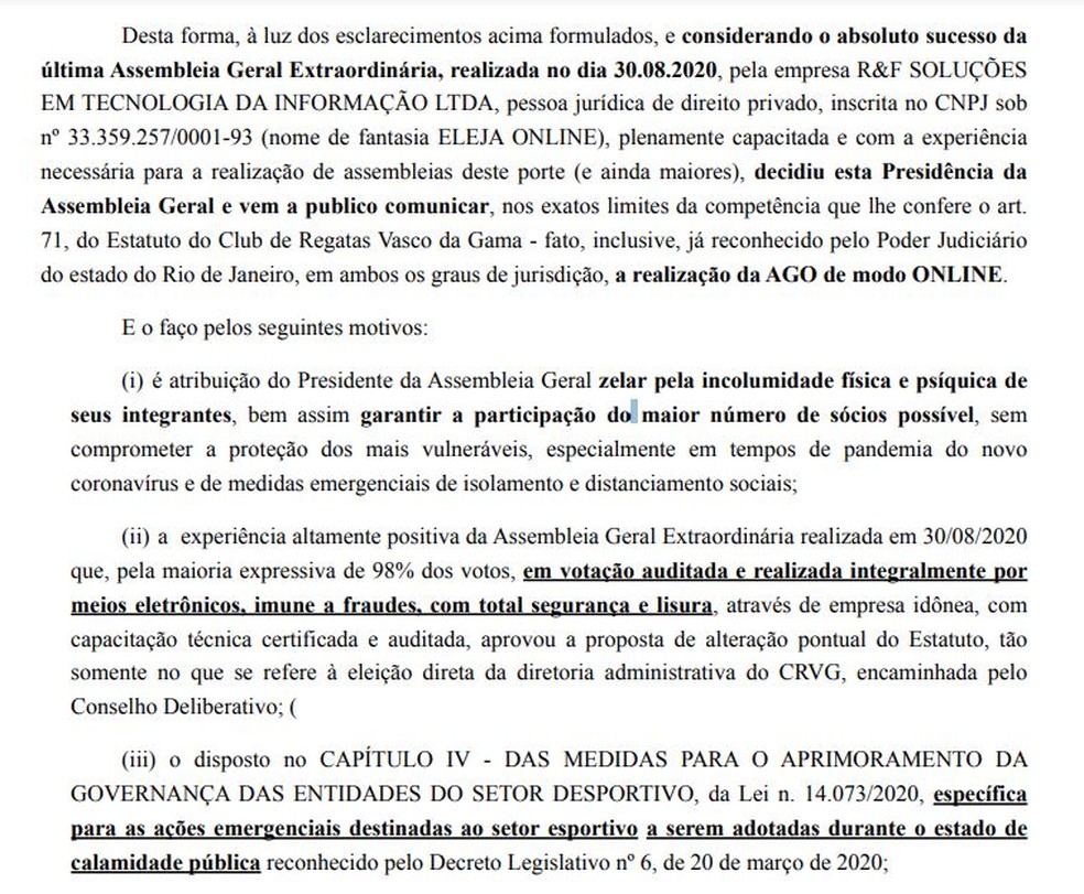 Em nota, presidente da Assembleia Geral afirma que eleições do Vasco serão realizadas via internet