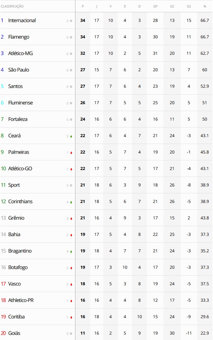 Dos jogos de domingo, apenas Athletico-PR x Grêmio pode influenciar na colocação do Vasco. Se o time paranaense vencer, ultrapassa o Gigante da Colina que, nesse caso, cairá da 17ª para a 18ª posição.