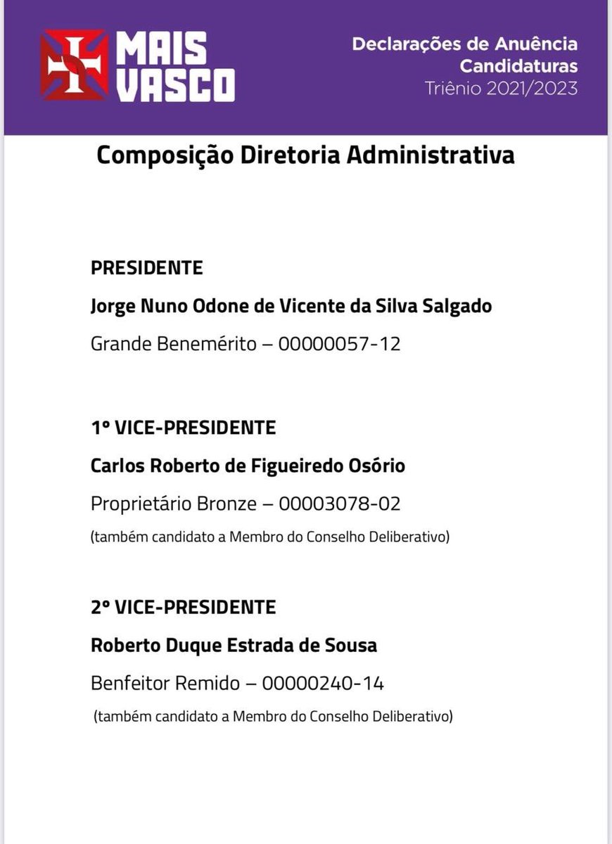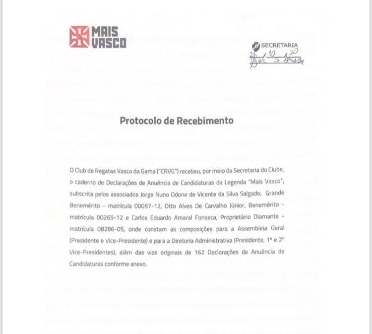 Eis o protocolo da Mais Vasco em que oficializa os nomes de Carlos Osório e Duque Estrada para a VP Geral.