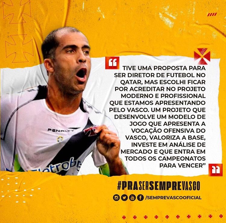 Felipe diz que recebeu proposta para ser diretor de futebol no Qatar, mas preferiu seguir com a Sempre Vasco "por acreditar no projeto moderno e profissional".