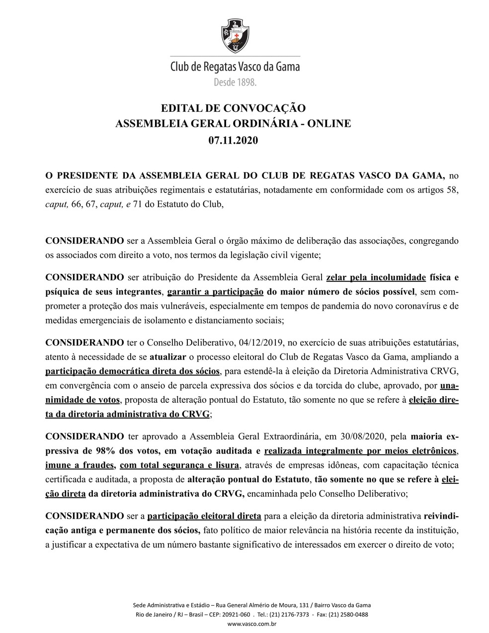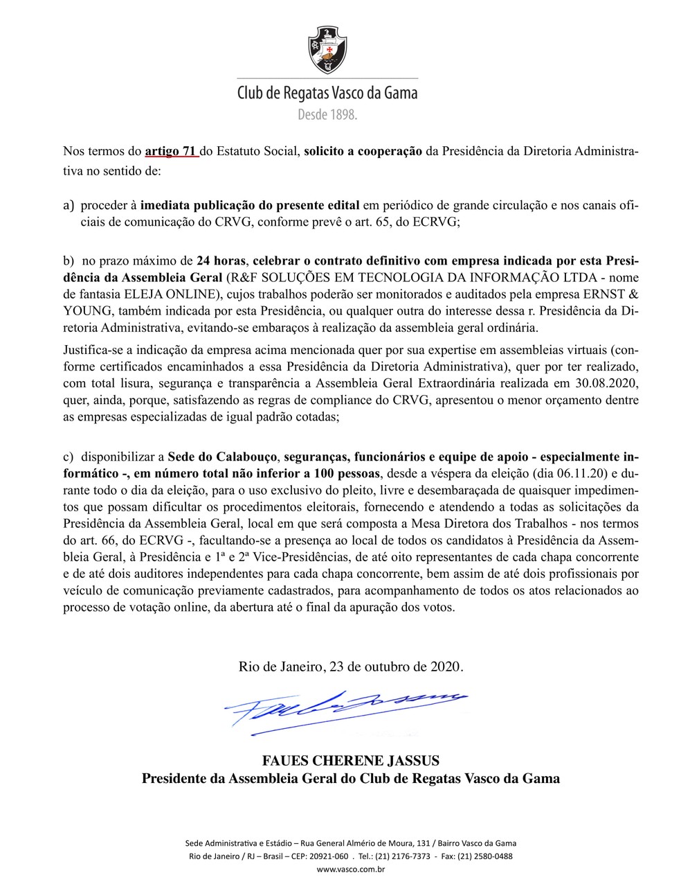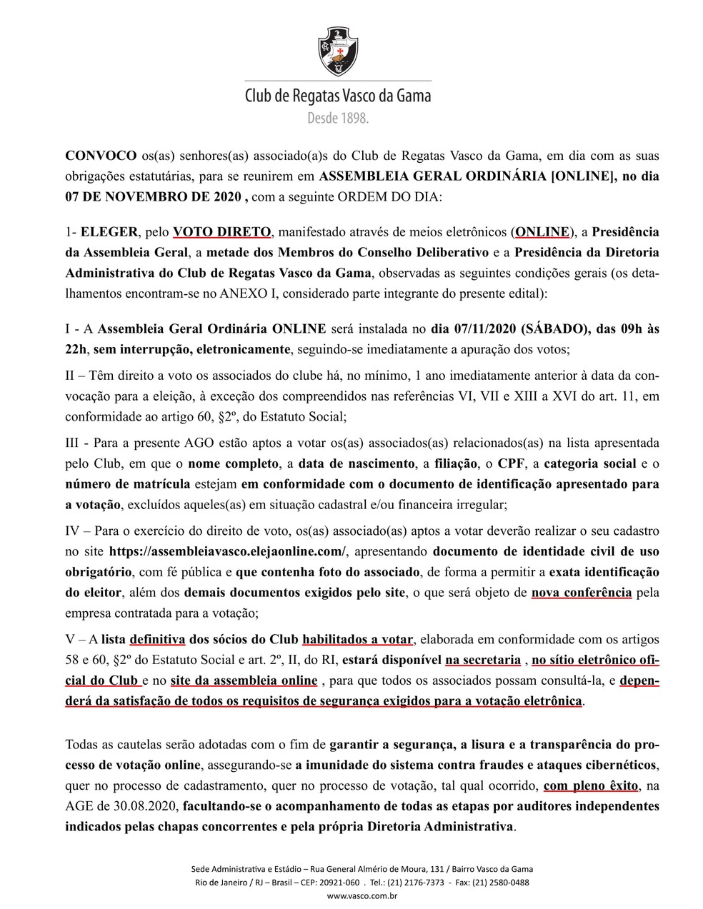 O presidente da Assembleia Geral do Vasco, Faués Cherene Jassus, o Mussa, enviou à Diretoria Administrativa edital que determina a realização das eleições presidenciais em ambiente virtual, ou seja, com voto online. Vale lembrar que discutia-se a realização de um pleito híbrido, também com voto presencial.