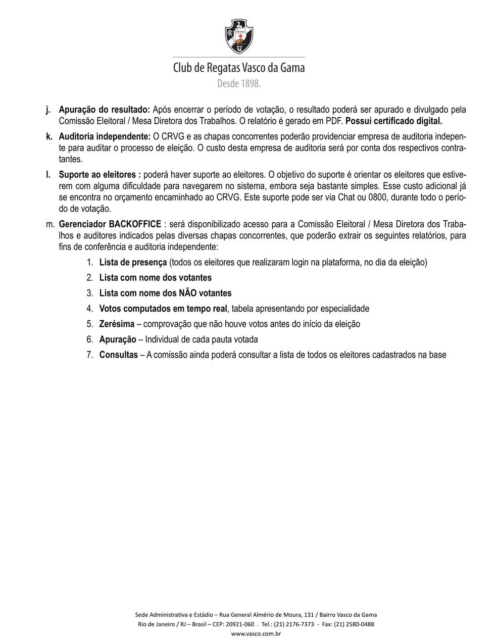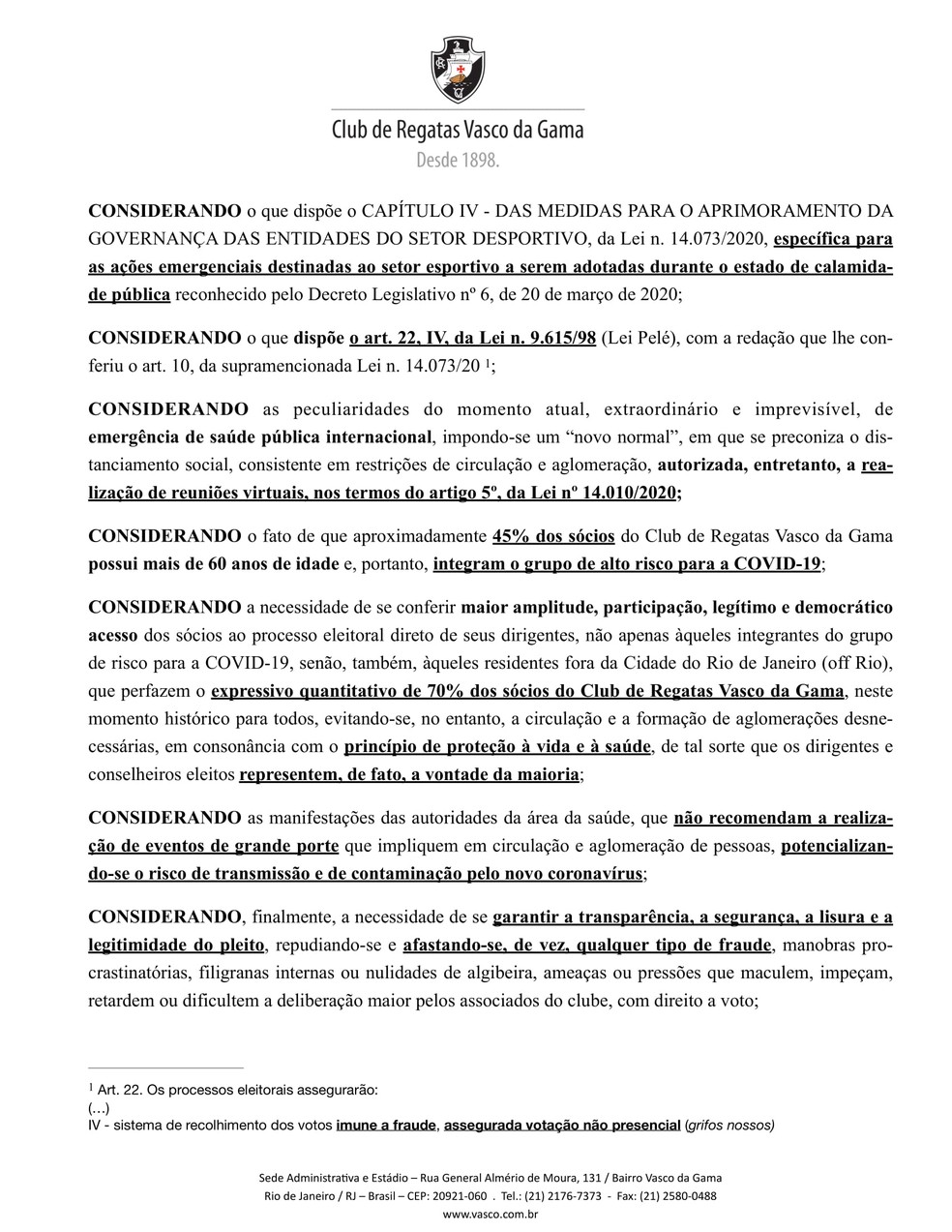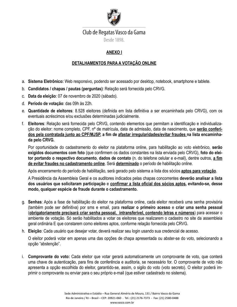 O presidente da Assembleia Geral do Vasco, Faués Cherene Jassus, o Mussa, enviou à Diretoria Administrativa edital que determina a realização das eleições presidenciais em ambiente virtual, ou seja, com voto online. Vale lembrar que discutia-se a realização de um pleito híbrido, também com voto presencial.