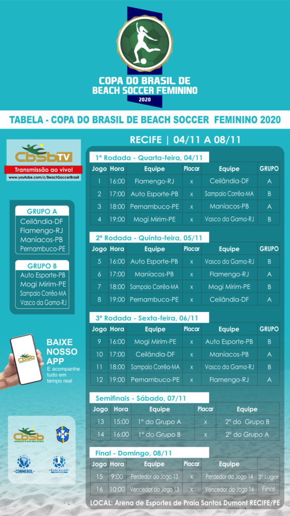 A tabela completa do torneio foi divulgada nesta segunda-feira (2/11). Abrindo a competição, teremos Flamengo x Ceilândia, na quarta-feira, 4/11, às 16h. Em seguida, às 17h, tem Auto Esporte x Sampaio Corrêa. A primeira equipe local a entrar em campo é Pernambuco, que encara o Sampaio Corrêa às 18h. Fechando o dia, no jogo das 19h, as pernambucanas do Mogi Mirim vão para cima do Vasco da Gama. (VEJA A TABELA COMPLETA CLICANDO NA IMAGEM ABAIXO).