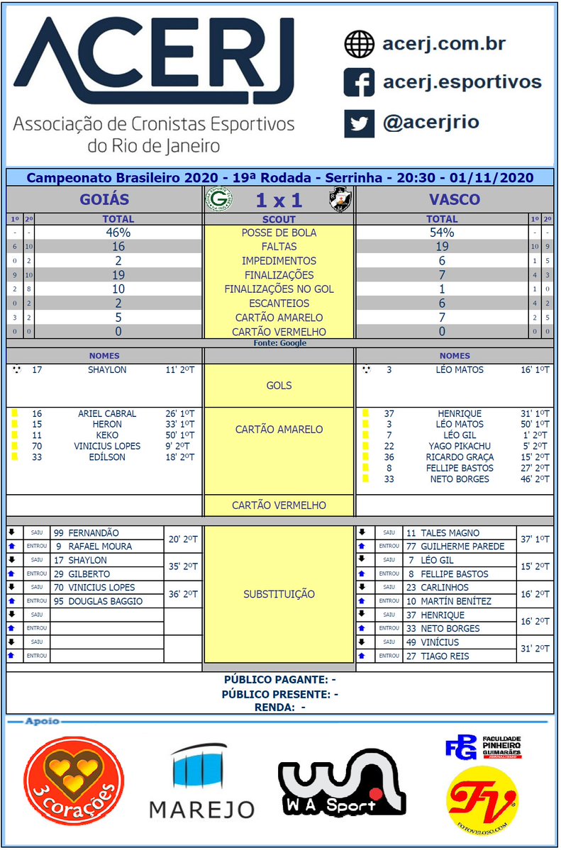 Cartões amarelos: Ariel Cabral, Heron, Keko, Vinícius Lopes e David Duarte (Goiás) e Henrique, Léo Matos, Léo Gil, Pikachu, Ricardo Graça, Fellipe Bastos e Neto Borges (Vasco)