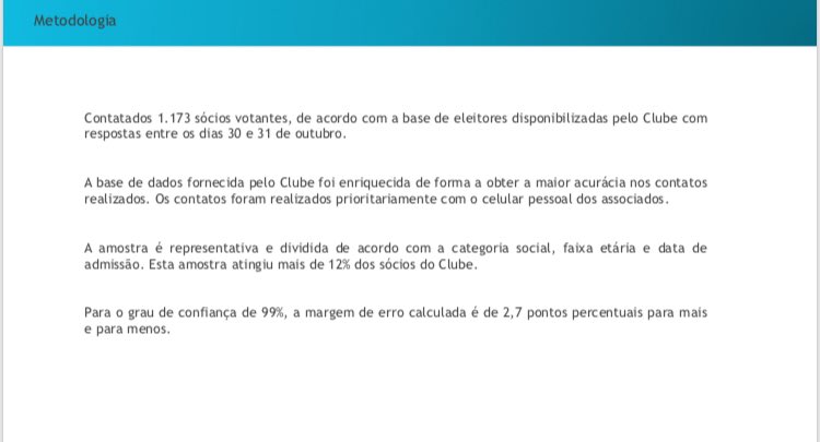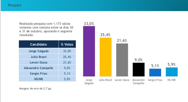 Participaram 1173 sócios, 12% do quadro, por ligação e SMS, entre 30 e 31/10, confiança de 99% e margem de 2,7%. Os números são de total responsabilidade da empresa.