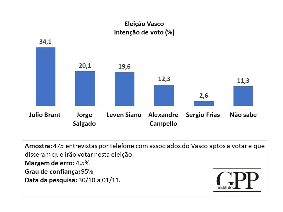 Pesquisa realizada pelo Instituto GPP entre os dias 30 de outubro e 1º de novembro sobre a eleição do Vasco.