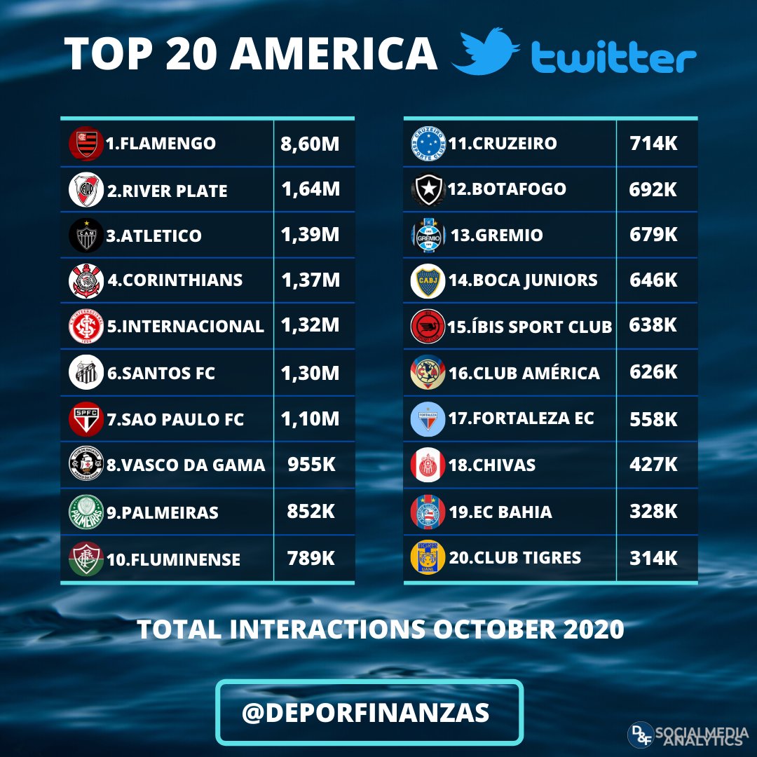 ?⚽ Los 20 clubes de América con más interacciones en #twitter durante octubre 2020.???