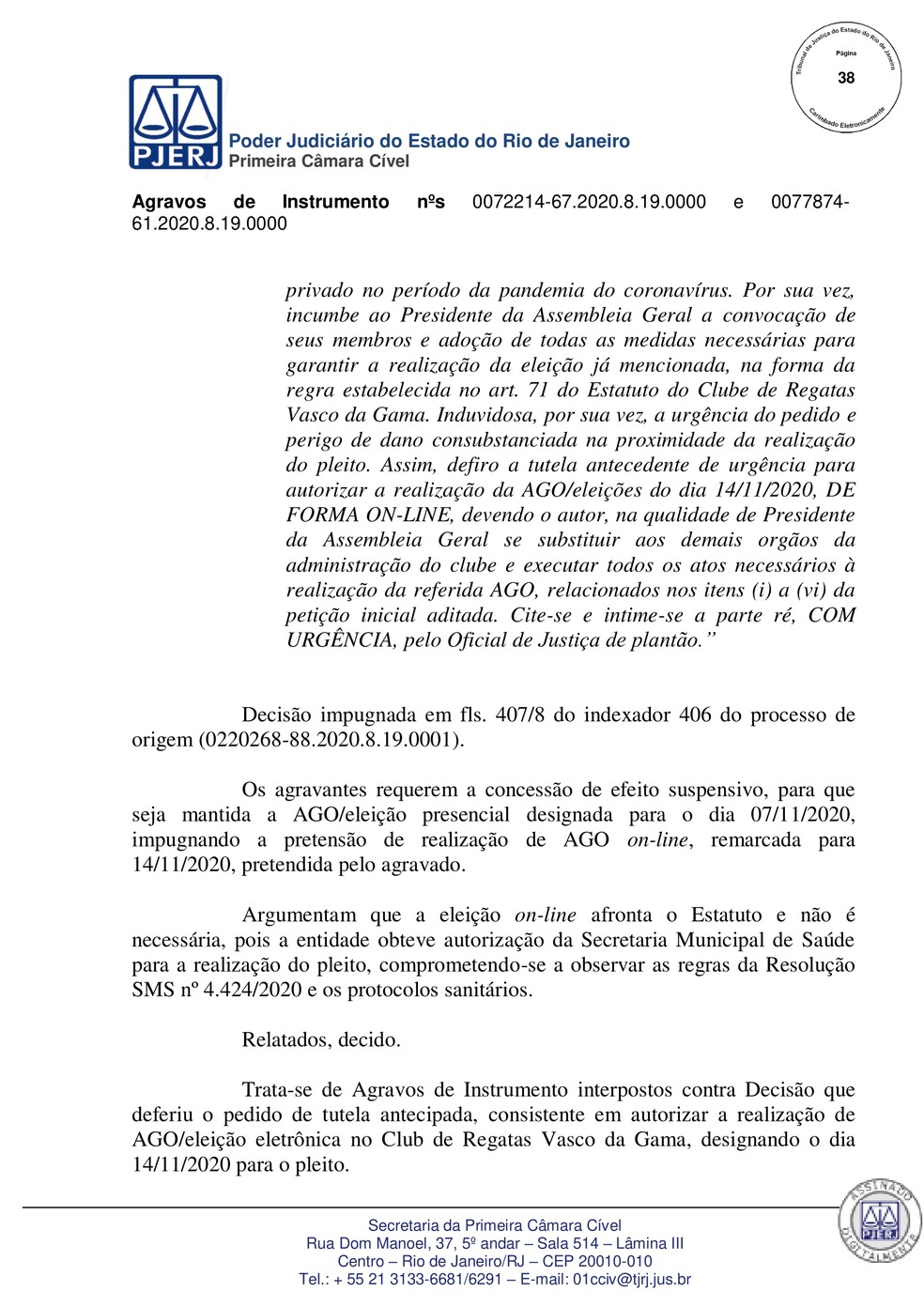 Consequentemente, com suporte no artigo 1.019, inciso I do Código de Processo Civil, suspendo a decisão agravada, mantendo a AGO/eleição presencial designada para 07/11/2020".