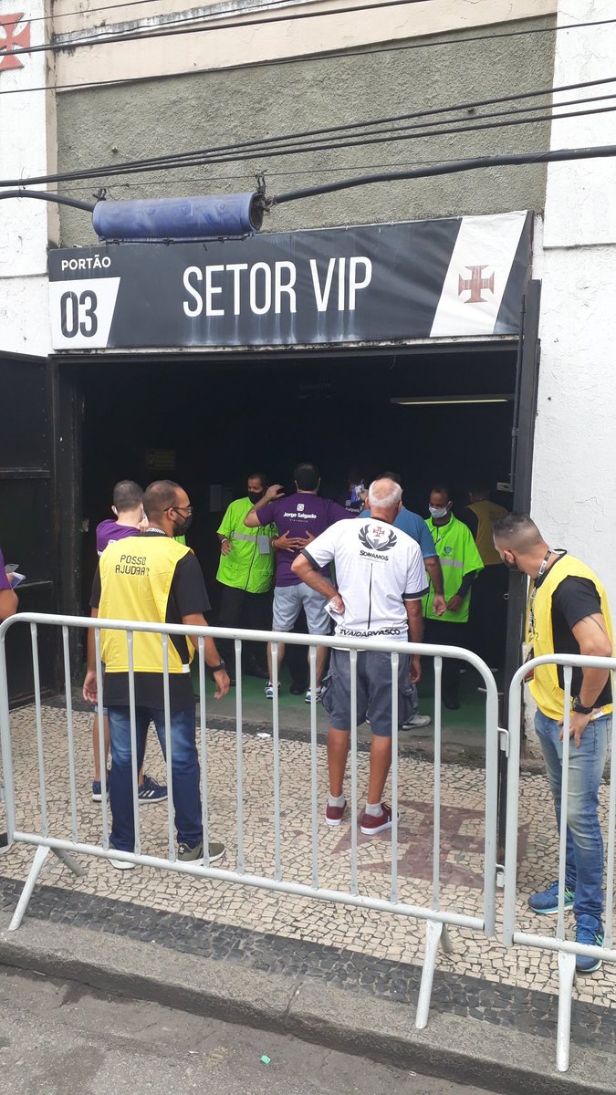 Sócios são revistados na entrada. Pelo menos aqui no Portão 03 não há medição de temperatura. Mas todos passam álcool gel nas mãos. E só é permitida a entrada de máscara. #VascoENM