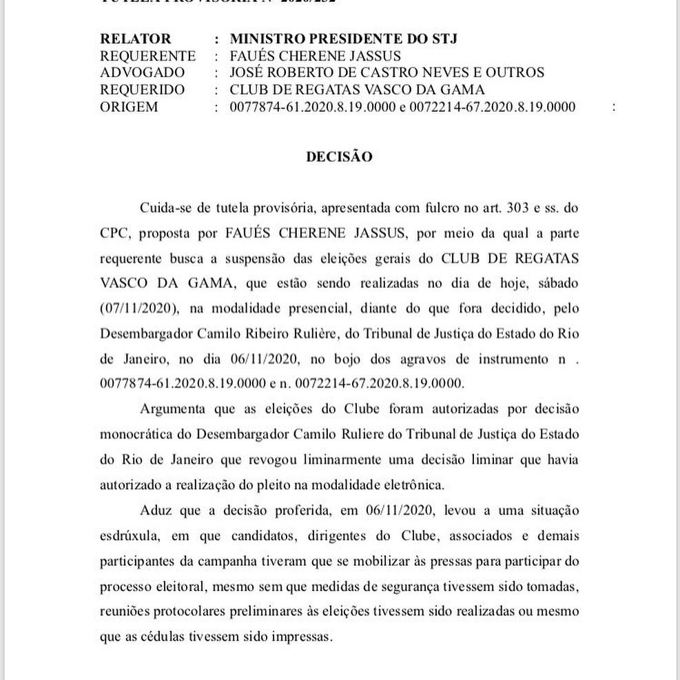 A eleição no Vasco está suspensa. A Justiça acatou pedido de tutela provisória feito por Faués Cherene Jassus, o Mussa, presidente da Assembleia Geral do Vasco. Na noite desta última sexta-feira, o desembargador Camilo Ribeiro Ruliére derrubou a liminar que determinava eleições online para o próximo dia 14.