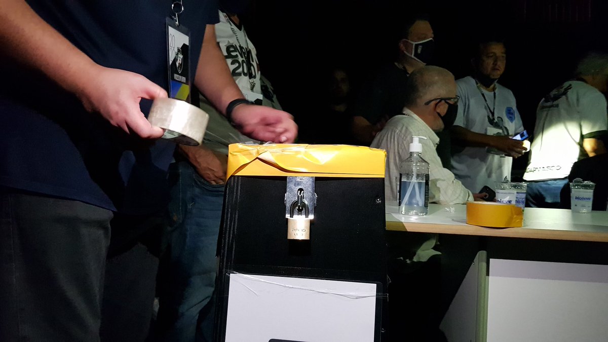 Após Campello deixar a retomada da votação, luzes do ginásio de São Januário foram apagadas, mas a mesa eleitoral seguiu trabalhando e agora eles lacram as urnas