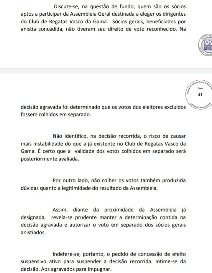 Durante a madrugada tivemos uma nova decisão da Justiça. O desembargador Cláudio Brandão de Oliveira, da 7a Câmara do TJRJ, negou liminar no recurso de Roberto Monteiro e manteve decisão de primeira instância liberando o voto dos sócios anistiados em urna separada #VascoENM