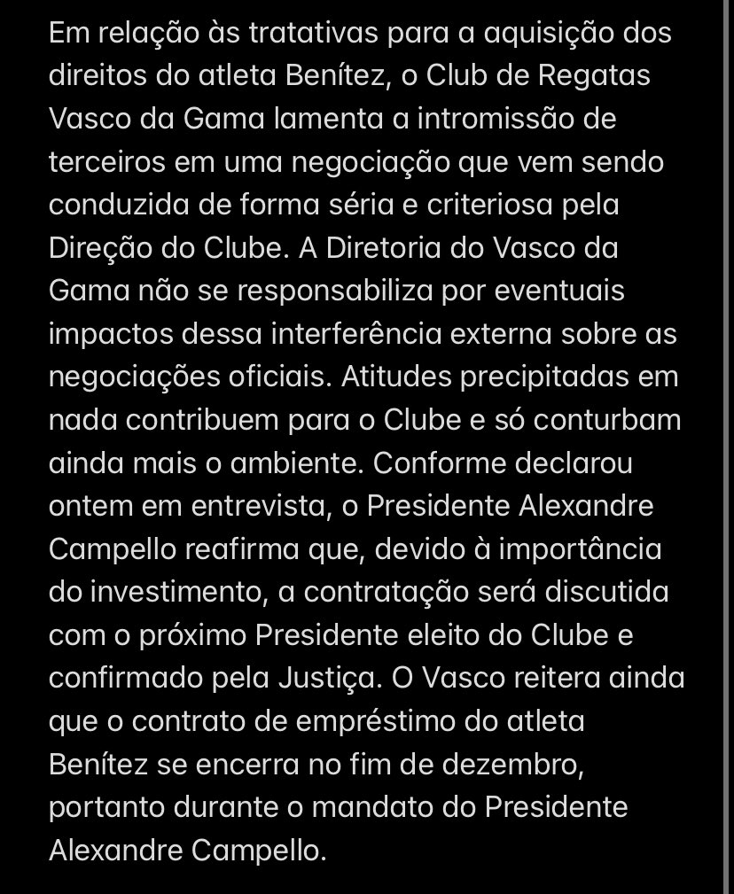 ATENÇÃO: Vasco divulga nota afirmando que "não se responsabiliza por eventuais impactos dessa interferências externa sobre as negociações oficiais". A diretoria ainda frisa que "atitudes precipitadas em nada contribui para o clube e só conturbam ainda mais o ambiente". ??