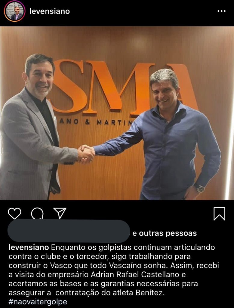 Mais cedo, Leven Siano, do Somamos, divulgou esta imagem dizendo que acertou as garantias para a compra de Benítez. Apesar de ter sido o candidato mais votado no pleito realizado dia 7/11, o STJ concedeu uma liminar e as eleições de sábado, no momento, não têm efeito eleitoral.