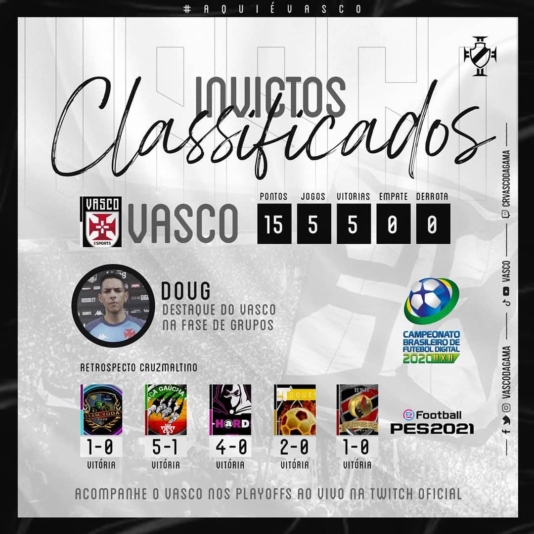 NINGUÉM SEGURA! O nosso time de eFootball PES assegurou a vaga para os playoffs com 100% de aproveitamento! Foram 5 jogos, 5 vitórias, 14 gols feitos e apenas 1 sofrido. O grande destaque do nosso time na fase de grupos foi o @dougdougoficial, que marcou 3 gols.